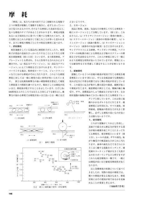 摩耗「摩耗」は、私たちの身の回りでよく経験される現象でえないようです。2つの物質が接触して運動する場合に、必ずと言っていい2.エロージョンほど見られるものです。そのような摩耗した表面を見ると、色々な摩耗のタイプがあることがわかります。摩耗は現象あるいは主原因などに基づいて種々に分類されており、ま部品に粉体、液体、気泡などが衝突して生じる摩耗を一般にエロージョンとして分類しています。(図1)。これはさらに、(a)ドライサンドエロージョン(粉体の衝突)、た実際にはこれらが混合して起こることが多いと思われま(b)スラリーエロージョン(液体中の粉体の衝突)、(c)レす。以下に摩耗の種類ごとにその特長を簡単に述べます。インエロージョン(液滴の衝突)、(d)キャビテーションエ1.研削摩耗ロージョン(液体中の気泡の衝突)などに分けられます。相対運動をしている部品内に硬質粒子が入ったり、硬質サンドブラストによる研磨、サンドポンプの摩耗、ヘリコ粒子が部品の表面をひっかいたりすることにより生じる摩耗を研削摩耗(図1)といいます。また粉体摩耗、アブレージョンとも呼ばれ、さらに作用する力の大小によりプターの回転翼の雨による摩耗および船のスクリューの摩耗などが代表的なものです。これらの摩耗に対して一般にはより高硬度な材料が良いとされていますが、環境によっ細分され、(a)低応力アブレージョン、(b)高応力アブレては耐食性などを考慮して選定することが必要となりまージョン、c)えぐり摩耗などに分けられます。サンドペーす。パーでこする場合、粉砕用ローラーミル、ジョークラッシ3.凝着摩耗ャなどにおける摩耗がそれに当たります。このような研削摩耗に対しては一般に硬度の高い材料が用いられています。図2は比較的衝撃力の強い研削摩耗を想定して硬度接触している2つの金属の凝着が原因で生じる摩耗を凝着摩耗といいます(図1)。平らな金属表面でも微視的に見れば完全に平滑な状態ではなく微小突起が存在していまと摩耗量との関係を調べたもので、傾向としては硬度が高す。この部分に応力が集中し微小部分の凝着、破断が起こいほど、摩耗量が低下することを示しています。ただしHvり摩耗が生じます。凝着摩耗の例としては、機械の軸と軸600程度以上のところではほとんど同じような値を示し、衝受け、ギヤ、各種部品のしゅう動面などがあります。なお撃力の加わる摩耗では硬度が高いほど良いとは一概には言相対運動の振幅が極めて小さい場合に生じる摩耗をフレッチングと称しています。これは常に振動のかかるボルトなどに生じます。凝着摩耗には作用圧力、すべり速度、材料組成、接触面の性状などが大きく影響し、必ずしも硬度の高いものが良いとは限らないようです。4.疲労摩耗ころがり接触がくりかえし作用し、表面下の最大せん断応力が発生する部分が疲れ破壊を起こすことによって生じる摩耗を、疲労摩耗といいます(図1)。レールの表面、ギヤの歯先、転がり軸受けの軌道面などがこれに当たります。歯車の歯先などでまだらに小さくはく離する現象をピッチング、硬化層やコーティング層が大きく欠落するのをスポーリングなどと呼びますがこれらも疲労摩耗の一種です。一般には硬度が高いほど耐疲労摩耗性が良くなります。以上各種摩耗の形態について述べてきましたが、実際の部品の摩耗では、種々の摩耗が重なる場合もあり、摩耗対策にはその要因が何であるかを見極めることが重要と考えます。(1988年7月号)146