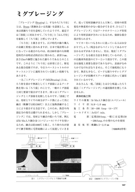 ミグブレージング「ブレージング(Brazing)」、すなわち「ろう付」す。従って母材溶融がほとんど無く、母材の材質とは、Brass(黄銅あるいは真鍮)を語源とし、元変化や熱変形の少ない接合ができます。さらに「ミ来は黄銅ろう付を意味していたようです。最近でグブレージング」ではアークのクリーニング作用は「溶接」に対比させて、「ろう付」と「はんだ付」により母材表面がきれいになるため、強固な接合を総称して「ろう接」と呼んでいます。部が得られます。「ろう付」と聞きますと、江戸時代の飾り職人マイカーをいつもきれいに洗っている人はお分の金細工程度に思われますが、日本で現在明らかかりでしょう。残念ながらペイントしてあるのでになっている最古のものは、約1300年前の大和朝分かるはずがありません)。実は、現在「ミグブレ廷時代の水時計式時計台に使われた、直径9㎜、ージング」なる接合方法を多用しているのが、こ長さ15mの銅管に施された銀ろうであるとのことの自動車外装部のピラーという部分です。この部です。このように「ろう付」は非常に古く、歴史分は強度上重要な部分でありながら、表面がなめある接合技術ですが、今日スペースシャトルのロらかでなければなりません。そこで強度的にも十ケットエンジンに適用されている新しい技術でも分で、熱歪も少なく、ビードも削りやすいミグブあります。レージングが炭酸ガスアーク溶接に代わって適用一方、ミグブレージング(MIGBrazing)」とは、されているのです。ろう材を溶かす熱源としてミグ溶接によるアークみなさんも一度、「溶接」とはひと味違ったろう熱を用いる「ろう接」のことで、一般のミグ溶接接法「ミグブレージング」の適用箇所を捜してみと同じ要領で接合ができます。図1はミグブレーませんか。ジングとミグ溶接を比較したものです。「溶接」で具体的施工例は、母材とワイヤの両方がアーク熱によって共にワイヤの種類:Si―Mn入り銅合金(エバジュール)融点(軟鋼では約1500℃)以上に加熱溶融するこワイヤ径:0.8〜1.0㎜φとにより接合する方法です。このため、熱歪や内部応力の発生は避けられません。しかし「ブレー工条施Ampシールドガス:Ar15/min.件:50〜100―14〜17Vジング」では、母材より融点の低いろう材、例え電源:定格350Amp.一般には定格150ばSi―Mn入り銅合金(エバジュール)ワイヤを用い〜200Amp.の小型のものを使用るため、融点は約1000℃と低く、ろう材のみが溶適用板厚:軟鋼0.5〜2.0t㎜けて継手隙間に毛管流動によって浸透していきま(1988年2月号)147