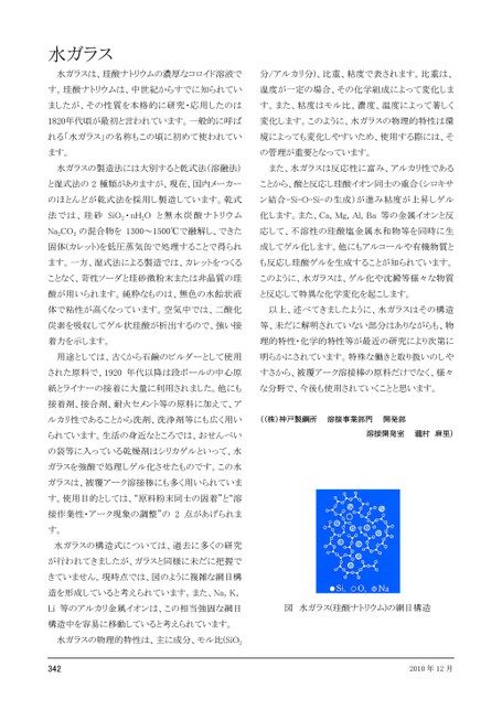 水ガラス水ガラスは、珪酸ナトリウムの濃厚なコロイド溶液で分/アルカリ分)、比重、粘度で表されます。比重は、す。珪酸ナトリウムは、中世紀からすでに知られてい温度が一定の場合、その化学組成によって変化しまましたが、その性質を本格的に研究・応用したのはす。また、粘度はモル比、濃度、温度によって著しく1820年代頃が最初と言われています。一般的に呼ば変化します。このように、水ガラスの物理的特性は環れる「水ガラス」の名称もこの頃に初めて使われてい境によっても変化しやすいため、使用する際には、そます。の管理が重要となっています。水ガラスの製造法には大別すると乾式法(溶融法)また、水ガラスは反応性に富み、アルカリ性であると湿式法の2種類がありますが、現在、国内メーカーことから、酸と反応し珪酸イオン同士の重合(シロキサのほとんどが乾式法を採用し製造しています。乾式ン結合-Si-O-Si-の生成)が進み粘度が上昇しゲル法では、珪砂SiO2・nH2Oと無水炭酸ナトリウム化します。また、Ca,Mg,Al,Ba等の金属イオンと反Na2CO3の混合物を1300~1500℃で融解し、できた応して、不溶性の珪酸塩金属水和物等を同時に生固体(カレット)を低圧蒸気缶で処理することで得られ成してゲル化します。他にもアルコールや有機物質とます。一方、湿式法による製造では、カレットをつくるも反応し珪酸ゲルを生成することが知られています。ことなく、苛性ソーダと珪砂微粉末または非晶質の珪このように、水ガラスは、ゲル化や沈澱等様々な物質酸が用いられます。純粋なものは、無色の水飴状液と反応して特異な化学変化を起こします。体で粘性が高くなっています。空気中では、二酸化以上、述べてきましたように、水ガラスはその構造炭素を吸収してゲル状珪酸が析出するので、強い接等、未だに解明されていない部分はありながらも、物着力を示します。理的特性・化学的特性等が最近の研究により次第に用途としては、古くから石鹸のビルダーとして使用明らかにされています。特殊な働きと取り扱いのしやされた原料で、1920年代以降は段ボールの中心原すさから、被覆アーク溶接棒の原料だけでなく、様々紙とライナーの接着に大量に利用されました。他にもな分野で、今後も使用されていくことと思います。接着剤、接合剤、耐火セメント等の原料に加えて、アルカリ性であることから洗剤、洗浄剤等にも広く用い((株)神戸製鋼所溶接事業部門開発部溶接開発室瀧村麻里)られています。生活の身近なところでは、おせんべいの袋等に入っている乾燥剤はシリカゲルといって、水ガラスを強酸で処理しゲル化させたものです。この水ガラスは、被覆アーク溶接棒にも多く用いられています。使用目的としては、“原料粉末同士の固着”と“溶接作業性・アーク現象の調整”の2点があげられます。水ガラスの構造式については、過去に多くの研究が行われてきましたが、ガラスと同様に未だに把握できていません。現時点では、図のように複雑な網目構造を形成していると考えられています。また、Na,K,2010年12月構造中を容易に移動していると考えられています。水ガラスの物理的特性は、主に成分、モル比(SiO2423Li等のアルカリ金属イオンは、この相当強固な網目図水ガラス(珪酸ナトリウム)の網目構造