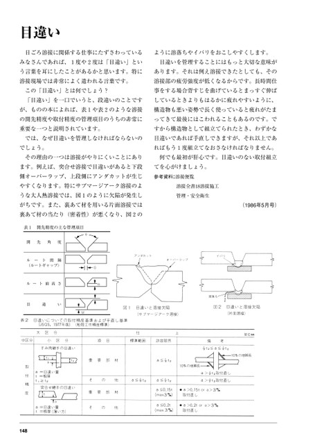 目違い日ごろ溶接に関係する仕事にたずさわっているように溶落ちやイバリをおこしやすくします。みなさんであれば、1度や2度は「目違い」とい目違いを管理することにはもっと大切な意味がう言葉を耳にしたことがあるかと思います。特にあります。それは例え溶接できたとしても、その溶接現場では非常によく遣われる言葉です。溶接部の疲労強度が低くなるからです。長時間仕この「目違い」とは何でしょう?事をする場合背すじを曲げているとまっすぐ伸ば「目違い」を一口でいうと、段違いのことですしているときよりもはるかに疲れやすいように、が、ものの本によれば、表1や表2のような溶接構造物も悪い姿勢で長く使っていると疲れがたまの開先精度や取付精度の管理項目のうちの非常にってきて最後にはこわれることもあるのです。で重要な一つと説明されています。すから構造物として組立てられたとき、わずかなでは、なぜ目違いを管理しなければならないの目違いであれば手直しできますが、それ以上であでしょう。ればもう1度組立てなおさなければなりません。その理由の一つは溶接がやりにくいことにあり何でも最初が肝心です。目違いのない取付組立ます。例えば、突合せ溶接で目違いがあると下段てを心がけましょう。側オーバーラップ、上段側にアンダカットが生じ参考資料;溶接便覧やすくなります。特にサブマージアーク溶接のような大人熱溶接では、図1のように欠陥が発生しがちです。また、裏あて材を用いる片面溶接では裏あて材の当たり(密着性)が悪くなり、図2の溶接全書18溶接施工管理・安全衛生(1986年5月号)表1開先精度の主な管理項目開先角度θGRル(ーー隔)ト間ルトギャップルート面高さ目違いM148