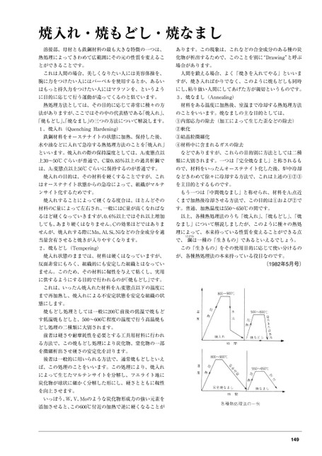 焼入れ・焼もどし・焼なまし溶接部、母材とも鉄鋼材料の最も大きな特徴の一つは、あります。この現象は、これなどの合金成分のある種の炭熱処理によってきわめて広範囲にその元の性質を変えるこ化物が析出するためで、このことを別に“Drawing”と呼ぶとができることです。場合があります。これは人間の場合、美しくなりたい人には美容体操を、人間を鍛える場合、よく「焼きを入れてやる」といいま腕に力をつけたい人にはバーベルを使用するとか、あるいすが、焼き入ればかりでなく、このように焼もどしも同時はもっと持久力をつけたい人にはマラソンを、というようにし、粘り強い人間にしてあげた方が親切というものです。に目的に応じて行う運動が違ってくるのと似ています。3.焼なまし(Annealing)熱処理方法としては、その目的に応じて非常に種々の方材料をある温度に加熱後、室温まで冷却する熱処理方法法がありますが、ここではその中の代表格である「焼入れ」、のことをいいます。焼なましの主な目的としては、「焼もどし」、焼なまし」の三つの方法について解説します。①内部応力の除去(加工によって生じた歪などの除去)1.焼入れ(QuenchingHardening)②軟化鉄鋼材料をオーステナイトの状態に加熱、保持した後、③結晶粒微細化水や油などに入れて急冷する熱処理方法のことを「焼入れ」④材料中に含まれるガスの除去といいます。焼入れの際の保持温度としては、A3変態点以などでありますが、これらの目的別に方法としては二種上30〜50℃ぐらいが普通で、C量0.85%以上の過共析鋼で類に大別されます。一つは「完全焼なまし」と称されるもは、A1変態点以上50℃ぐらいに保持するのが普通です。ので、材料をいったんオーステナイト化した後、炉中冷却焼入れの目的は、その材料を硬くすることですが、これなどきわめて徐々に冷却する方法で、これは上述の①②③はオーステナイト状態からの急冷によって、組織がマルテを主目的とするものです。ンサイト化するためです。もう一つは「中間焼なまし」と称せられ、材料をA1点近焼入れすることによって硬くなる度合は、ほとんどそのくまで加熱後冷却させる方法で、この目的は①および②で材料のC量によって左右され、一般にはC量が高くなればなす。普通、加熱温度は550〜650℃の間です。るほど硬くなっていきますが、0.6%以上ではそれ以上増加以上、各種熱処理法のうち「焼入れ」、「焼もどし」、「焼しても、あまり硬くはなりません。Cの効果ほどではありまなまし」について解説しましたが、このように種々の熱処せんが、焼入れする際にMn,Al,Si,Niなどの合金成分を適当量含有させると焼きが入りやすくなります。理によって、本来持っている性質を変えることができる点で、鋼は一種の「生きもの」であるといえるでしょう。はがね2.焼もどし(Tempering)この「生きもの」をその使用目的に応じて使い分けるの焼入れ状態のままでは、材料は硬くはなっていますが、が、各種熱処理法の本来持っている役目なのです。反面非常にもろく、組織的にも安定した組織とはなっていません。このため、その材料に靱性を与えて粘くし、実用に供するようにする目的で行われるのが「焼もどし」です。これは、いったん焼入れた材料をA1変態点以下の温度にまで再加熱し、焼入れによる不安定状態を安定な組織の状態にします。焼もどし処理としては一般に200℃前後の低温で焼もどす低温焼もどしと、500〜600℃程度の温度で行う高温焼もどし処理の二種類に大別されます。前者は硬さや耐摩耗性を必要とする工具用材料に行われる方法で、この焼もどし処理により炭化物、窒化物の一部を微細析出させ硬さの安定化を計ります。後者は一般的に用いられる方法で、通常焼もどしといえば、この処理のことをいいます。この処理により、焼入れによって生じたマルテンサイトを分解し、フエライト地に炭化物が球状に細かく分解した形にし、硬さとともに靱性を向上させます。いっぽう、W,V,Moのような炭化物形成力の強い元素を添加させると、この600℃付近の加熱で逆に硬くなることが(1982年5月号)149