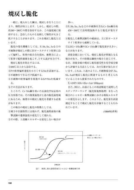 焼戻し脆化一般に、焼入れした鋼は、焼戻しを行うことに多い。より、靭性が向上します。しかし、焼戻しの際、③P,Sb,Sn,Asなどの不純物を含むCr―Mo鋼を約約380〜580℃の間を徐冷するか、この温度域に保450〜580℃で長時間加熱すると脆化が発生す持すると、急冷したものと比較して靭性が大きくる。低下することがあります。これを焼戻し脆化と言④脆化した衝撃試験片の破面は、主に旧オーステいます。ナイト粒界から破断している。脆化の発生機構としては、P,Sb,Sn,Asなどの⑤2.25Cr―1Mo鋼や3Cr―1Mo鋼で脆化量が大きい。不純物が焼戻しの際に旧オーステナイト粒界に沿などがあります。って偏析し、粒界の結合力を弱め、衝撃力によっ溶接金属においても、焼戻し脆化が問題となるて粒界で脆性破壊を起こす、とする説が有力です。場合があり、その特徴は鋼材の場合と同じです。焼戻し脆化を防止するには、①600℃以上から急冷する。なお、溶接金属の焼戻し脆化感受性を化学成分値から評価する方法としては、次のX値が知られて――②Pの粒界偏析速度を小さくするMoを添加する。います。これは、上述のように、不純物成分(P,Sn,③不純物をできるだけ低減する。Sb,As)が焼戻し脆化に関連するものと考えられ④不純物の粒界偏析を促進するSiやMnを低減すていることから提案されたものです。る。――X=(10P+5Sb+4Sn+As)/100(ppm)などの方法があります。また、図1に、以前にもこの用語解説で説明したところで、Cr―Mo鋼を用いた石油化学反応用のステップクーリング(脆化促進熱処理)を行った圧力容器では、その操業温度が上述の脆化温度域場合のシャルピー衝撃試験における吸収エネルギにあるため、操業中の焼戻し脆化を考慮する必要ーの変化を示します。このように、脆化量を直接があります。測定することで焼戻し脆化を評価することも行わこの場合の焼戻し脆化の特徴としては、れています。①硬さや引張特性には現れず、脆化過程前後の衝撃試験の遷移温度の変化として現れる。②その際、上部棚エネルギーは変化しない場合が(1994年3月号)脆化前脆化量脆化後図1焼戻し脆化過程前後のシャルピー衝撃曲線の例150
