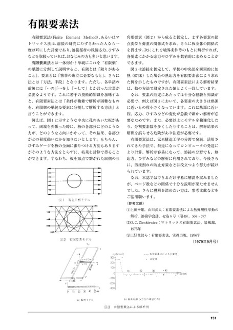 有限要素法有限要素法(FiniteElementMethod)、あるいはマ角形要素(図2)から成ると仮定し、まず各要素の節トリックス法は、溶接の研究にたずさわった人なら一点変位と荷重の関係式を求め、さらに板全体の関係式度は耳にした言葉であり、溶接部材の残留応力、ひずみを得ます。次にこれを境界条件等のもとに解析すれば、などを取扱っていれば、おなじみの方も多いと思います。各要素にかかる応力やひずみを数値的に求めることが有限要素法とは一体何か?単純にこれを“有限個”できます。の単語に分割して説明すると、有限とは「限りがある図3は溶接を仮定して、平板の中央部を瞬間的に加こと」、要素とは「物事の成立に必要なもと」、さらに熱(873K)した場合の熱応力を有限要素法により求め法とは「方法、手段」となります。ただし、各単語のた例を示したものですが、有限要素法による解析結果前後には「…の」…を」、「…して」とか言った言葉がは、他の方法で測定された値とよく一致しています。必要なようです。これに若干の技術的知識を加味するなお、要素の設定にあたっては十分な経験と知識がと、有限要素法とは「条件が複雑で解析が困難なもの必要で、例えば図3において、各要素の大きさは熱源を、有限個の単純な要素に分割して解析する方法」とに近いもの程小さくなっています。これは熱源に近い言うことができます。程、応力、ひずみなどの変化が急激で細かい解析が必例えば、図1に示すような中央に孔のあいた板があ要なためです。また、必要以上にモデルを複雑化したって、両端を引張った時に、板の各部分にどのようなり、分割要素数を多くしたりすることは、解析結果の力が、どのような方向にかかって、その結果、各部分解釈を誤らせる危険があり注意が必要です。がどの程度動いたかを知りたいとします。もちろん、有限要素法は、元来構造工学の分野で発展、活用さひずみゲージを板の全面に張りつける方法もありますれてきた手法で、最近になってコンピュータの発達にがそのような方法をとらずに、結果を計算で得ることより計算、解析が容易になって、溶接の分野でも、熱ができます。すなわち、板を節点で繋がれた50個の三応力、ひずみなどの解析に利用されており、今後さらに、溶接割れの防止対策などに役立つよう努力が続けられています。なお、本誌ではできるだけ平易に解説を試みましたが、ページ数などの関係で十分な説明が果たせませんでした。さらに理解を深めたい方は、参考文献などをご活用願います。(参考文献)上田幸雄,山川武人:有限要素法による熱弾塑性挙動の解析,溶接学会誌,42巻6号(昭48),567〜577O.C.Zienkiewicz:マトリックス有限要素法,培風館,1975年三好俊郎ら:有限要素法,実教出版,1976年(1979年9月号)σy(N/mm2)3002001000-100-200-300151