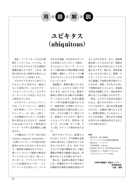 用語解説ユビキタス(ubiquitous)現在、インターネットなどの情力や音声認識、そのほかのデバイることができます。また、賞味期報ネットワークに、いつでも、どスを活用したコンピュータ操作、限が迫っているものとか、期限がこからでもアクセスできる環境のさらにはコンピュータ・ネット切れているものを伝えることも可整備が進んでいます。これは、場ワーク側が個人や現実環境の状況能となります。他には、回収対象所に囚われない利用を目的としたを把握・判断し、アクティブに働となったものに対して、新聞・テ「ユビキタス」に由来します。きかけるといったことまでが視野レビ・インターネットといったもユビキタスとはラテン語で、いに入っています。のに掲載して回収を呼び掛けていたるところに存在する(遍在)」現段階で、開発が進んでいるもたものが、直接、そのものに対しという意味です。「ユビキタス・のとして、ユビキタスIDタグがて情報を流すことにより、具体的コンピューティング」、「ユビキタあります。IDタグとは、物体のな所在を把握したり、回収を呼びス・ネットワーク社会」のように識別に利用される微小な無線IC掛けることも可能となるのです。も使われています。チップを示します。自身の識別将来、ユビキタス社会が実現さユビキタス・コンピューティンコード等の情報が記録されておれると、様々なものがネットワーグは、「メインフレーム(複数でり、電波を使って管理システムとクにつながれて、我われが無意識一台を使用)」、「パーソナルコン情報を送受信する能力を持っていのうちに、自動的に様々なことをピュータ(一人一台)」に続く、ます。大きさは数ミリ〜数センチし、情報を提供してくれるといっ一人が複数のコンピュータを使うで、重量が1グラム以下〜数グラたことが実現し、誰もがその恩恵第3世代を示したもので、1989年ムとなっています。形状は、ICを受けられる便利な社会となるこにXerox社パロアルト研究所のチップ、ラベル型、カード型、コとが予想されます。マーク・ワイザー氏が提唱した概イン型、スティック型等がありま念です。す。この概念は、ワイザー氏の「HCIIDタグのメモリに、情報を入出典(humancomputerinteraction)」れておくことで、その情報を必要(人間とコンピュータの相互作用)な時に読み出して活用することが研究の中から生まれてきたもの考えられます。また、IDタグかで、場所的な制約ばかりでなく、らセンサや他の機器を介して他の使いにくさという制約の解消が機器が情報を自動的に読込み、作テーマとなっています。従って、動させることも可能となります。キーボード、アイコンとマウスと例えば、食品等に取付けた場合いった伝統的なユーザー・インには、冷蔵庫やセンサと組合せてターフェイスに代わって、ペン入冷蔵庫内の温度を最適な設定にす・株式会社富士通総研サイバービジネスの法則集基礎知識・株式会社インセプトIT用語辞典e-Words・NIKKEINETITBUSINESS&NEWSIT活用のヒントを探るビジネスeyeユビキタスネットワーク社会(㈱神戸製鋼所溶接カンパニー技術開発部)山越道貴32