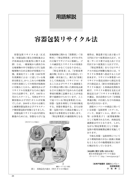 用語解説容器包装リサイクル法容器包装リサイクル法(正式装廃棄物に関わる「消費者」・「市要件は、製造業で売上高2億4千名:容器包装に係る分別収集およ町村」・「特定事業者」がそれぞれ万円以下かつ従業員20人以下、小び再商品化の促進等に関する法の立場でリサイクルに参画し、ゴ売・サービス業では売上高7千万律)とは、一般家庭から排出されミの減容化とリサイクルの実現を円以下かつ従業員5人以下です。る廃棄物の中で容器ならびに包装図っていかなくてはなりません。「特定事業者」自らではリサイ廃棄物の占める割合が容積比で6「特定事業者」は、「分別基準クルの対応が困難な場合には、リ割、重量比で2〜3割(1997年厚適合物」を自ら(または委託して)サイクル事業者へ委託することが生省調査による)に達している現運搬・再生加工し、新たな「資源」出来ます。リサイクル事業者への状を踏まえ、かつ、これらの廃棄物として再商品化(リサイクル)すの再生資源としての利用が技術的ることおよびリサイクル義務量とに可能なことから、減容化およびその算定の際に用いた排出見込量リサイクル委託は国から指定を受けた指定法人〔日本容器包装リサイクル協会〕と再商品化契約をリサイクルを促進するために施行などの主務法令で定められた必要結び、リサイクル費用を支払えばされた法律です。まず、1997年4事項を帳簿に記載することが本法指定法人が「リサイクル事業者」月からスタートし、当初はガラス律で義務付けられています。ここの選定、各自治体からの「分別基製容器およびPETボトルが対象で述べている「特定事業者」とは、準適合物」の引渡しなどの再商品でしたが、2000年4月からは新た容器・包装を利用して中身を販売化の代行を行います。に紙製容器包装およびプラスチッする、容器を製造する、または容溶接カンパニーの商品に用いてク製容器包装が対象となりました。器・包装の付いた商品を輸入している容器・包装材料(スプール,容器包装リサイクル法の円滑な販売する事業者などを指します。パック,防湿フィルム,段ボール推進のためには、容器ならびに包「特定事業者」の適用除外となる等)は事業系ゴミ(産業廃棄物)として処理されるため、再商品化義務量はゼロとなります。しかしながら「特定事業者」として容器・包装の使用量帳簿記載を実施しております。今後も容器・包装材料についてより環境負荷の少ない技術に取組むとともにその他環境保全に向けた検討を行っていきます。〔本法律に関する問い合わせ先〕日本容器包装リサイクル協会(ホームページ:http://www.jcpra.or.jp/)(㈱神戸製鋼所溶接カンパニー技術開発部)小松伸二[PETボトルの場合]①製造業:売上高2億4千万円超、従業員20人超②小売・サービス業:売上高7千万円超、従業員5人超リサイクル義務の履行消費者リサイクル費用¥特定事業者PETボトルのメーカー飲料メーカー(財)日本容器包装リサイクル協会再商品化事業者(リサイクル)¥リサイクル委託料指定法人引取契約市町村図1再商品化の流れ(PETボトルの場合)繊維メーカーなどへ販売24