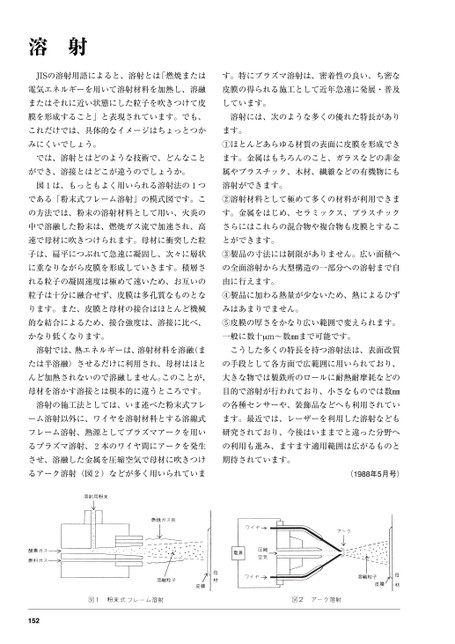 溶射JISの溶射用語によると、溶射とは「燃焼またはす。特にプラズマ溶射は、密着性の良い、ち密な電気エネルギーを用いて溶射材料を加熱し、溶融皮膜の得られる施工として近年急速に発展・普及またはそれに近い状態にした粒子を吹きつけて皮しています。膜を形成すること」と表現されています。でも、溶射には、次のような多くの優れた特長がありこれだけでは、具体的なイメージはちょっとつかます。みにくいでしょう。①ほとんどあらゆる材質の表面に皮膜を形成できでは、溶射とはどのような技術で、どんなことます。金属はもちろんのこと、ガラスなどの非金ができ、溶接とはどこが違うのでしょうか。属やプラスチック、木材、繊維などの有機物にも図1は、もっともよく用いられる溶射法の1つ溶射ができます。である「粉末式フレーム溶射」の模式図です。こ②溶射材料として極めて多くの材料が利用できまの方法では、粉末の溶射材料として用い、火炎のす。金属をはじめ、セラミックス、プラスチック中で溶融した粉末は、燃焼ガス流で加速され、高さらにはこれらの混合物や複合物も皮膜とするこ速で母材に吹きつけられます。母材に衝突した粒とができます。子は、扁平につぶれて急速に凝固し、次々に層状③製品の寸法には制限がありません。広い面積へに重なりながら皮膜を形成していきます。積層さの全面溶射から大型構造の一部分への溶射まで自れる粒子の凝固速度は極めて速いため、お互いの由に行えます。粒子は十分に融合せず、皮膜は多孔質なものとな④製品に加わる熱量が少ないため、熱によるひずります。また、皮膜と母材の接合はほとんど機械みはあまりでません。的な結合によるため、接合強度は、溶接に比べ、⑤皮膜の厚さをかなり広い範囲で変えられます。かなり低くなります。一般に数十µm〜数㎜まで可能です。溶射では、熱エネルギーは、溶射材料を溶融(まこうした多くの特長を持つ溶射法は、表面改質たは半溶融)させるだけに利用され、母材はほとの手段として各方面で広範囲に用いられており、んど加熱されないので溶融しません。このことが、大きな物では製鉄所のロールに耐熱耐摩耗などの母材を溶かす溶接とは根本的に違うところです。目的で溶射が行われており、小さなものでは数㎜溶射の施工法としては、いま述べた粉末式フレの各種センサーや、装飾品などへも利用されていーム溶射以外に、ワイヤを溶射材料とする溶線式ます。最近では、レーザーを利用した溶射などもフレーム溶射、熱源としてプラズマアークを用い研究されており、今後はいままでと違った分野へるプラズマ溶射、2本のワイヤ間にアークを発生の利用も進み、ますます適用範囲は広がるものとさせ、溶融した金属を圧縮空気で母材に吹きつけ期待されています。るアーク溶射(図2)などが多く用いられていま(1988年5月号)152