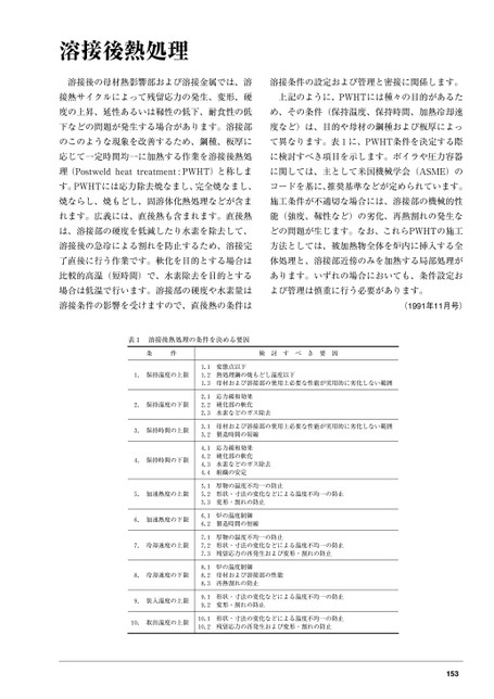 溶接後熱処理溶接後の母材熱影響部および溶接金属では、溶溶接条件の設定および管理と密接に関係します。接熱サイクルによって残留応力の発生、変形、硬上記のように、PWHTには種々の目的があるた度の上昇、延性あるいは靱性の低下、耐食性の低め、その条件(保持温度、保持時間、加熱冷却速下などの問題が発生する場合があります。溶接部度など)は、目的や母材の鋼種および板厚によっのこのような現象を改善するため、鋼種、板厚にて異なります。表1に、PWHT条件を決定する際応じて一定時間均一に加熱する作業を溶接後熱処に検討すべき項目を示します。ボイラや圧力容器理(Postweldheattreatment:PWHT)と称しまに関しては、主として米国機械学会(ASME)のす。PWHTには応力除去焼なまし、完全焼なまし、コードを基に、推奨基準などが定められています。焼ならし、焼もどし、固溶体化熱処理などが含ま施工条件が不適切な場合には、溶接部の機械的性れます。広義には、直後熱も含まれます。直後熱能(強度、靱性など)の劣化、再熱割れの発生なは、溶接部の硬度を低減したり水素を除去して、どの問題が生じます。なお、これらPWHTの施工溶接後の急冷による割れを防止するため、溶接完方法としては、被加熱物全体を炉内に挿入する全了直後に行う作業です。軟化を目的とする場合は体処理と、溶接部近傍のみを加熱する局部処理が比較的高温(短時間)で、水素除去を目的とするあります。いずれの場合においても、条件設定お場合は低温で行います。溶接部の硬度や水素量はよび管理は慎重に行う必要があります。溶接条件の影響を受けますので、直後熱の条件は(1991年11月号)表11.2.3.4.5.6.7.8.9.10.溶接後熱処理の条件を決める要因条件検討すべき要因保持温度の上限保持温度の下限保持時間の上限保持時間の下限加速熱度の上限加速熱度の下限冷却速度の上限冷却速度の下限装入温度の上限取出温度の上限1.11.21.32.12.22.33.13.24.14.24.34.45.15.25.36.16.27.17.27.38.18.28.39.19.210.110.2変態点以下の熱処理鋼および母材焼溶接部もどしの温度以下使用上必要な性能が実用的に劣化しない範囲応力緩和効果硬化部軟化水素などのガスの除去母材製造時間およびの溶接部短縮の使用上必要な性能が実用的に劣化しない範囲の応力緩和効果硬化部軟化水素組織などのガスの安定除去の厚物形状・寸法変形・割温度不均一変化防止のれの防止のなどによる温度不均一の防止温度制御の炉製造時間の短縮の厚物形状・寸法の残留応力温度不均一の変化再発生防止のなどによるおよび温度不均一防止の防止変形・割れのの炉母材再熱割温度制御およびれの溶接部防止の性能形状・寸法変形・割のれの変化防止などによる温度不均一の防止形状・寸法の残留応力の変化再発生などによるおよび変形・割れのの防止温度不均一防止153