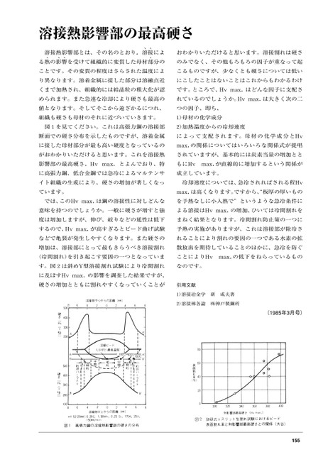 1551)溶接冶金学新成夫著2)溶接棒各論㈱神戸製鋼所(1985年3月号)おわかりいただけると思います。溶接割れは硬さによ接溶接熱影響部とは、その名のとおり,溶分ののみでなく、その他もろもろの因子が重なって起を受けて組織的に変質した母材部響る熱の影ことです。その変質の程度はさらされた温度によこるものですが、少なくとも硬さについては低いり異なります。溶着金属に接した部分は溶融点近にこしたことはないことはこれからもわかるわけくまで加熱され、組織的には結晶粒の粗大化が認です。ところで、Hvmax.はどんな因子に支配さめられます。また急速な冷却により硬さも最高のれているのでしょうか。Hvmax.は大きく次の二値となります。そしてそこから遠ざかるにつれ、つの因子、即ち、組織も硬さも母材のそれに近づいていきます。1)母材の化学成分図1を見てください。これは高張力鋼の溶接部2)加熱温度からの冷却速度断面での硬さ分布を示したものですが、溶着金属によって支配されます。母材の化学成分とHvに接した母材部分が最も高い硬度となっているのmax.の関係についてはいろいろな関係式が提唱がおわかりいただけると思います。これを溶接熱されていますが、基本的には炭素当量の増加とと影響部の最高硬さ、Hvmax.とよんでおり、特もにHvmax.が直線的に増加するという関係がに高張力鋼、低合金鋼では急冷によるマルテンサ成立しています。イト組織の生成により、硬さの増加が著しくなっ冷却速度については、急冷されればされる程Hvています。max.は高くなります。ですから、板厚の厚いものでは、このHvmax.は鋼の溶接性に対しどんなを予熱なしに小入熱で”というような急冷条件に意味を持つのでしょうか。一般に硬さが増すと強よる溶接はHvmax.の増加、ひいては冷間割れを度は増加しますが、伸び、絞りなどの延性は低下まねく結果となります。冷間割れ防止策の一つにするので、Hvmax.が高すぎるとビード曲げ試験予熱の実施がありますが、これは溶接部が除冷さなどで亀裂が発生しやすくなります。また硬さのれることにより割れの要因の一つである水素の拡増加は、溶接部にとって最もきらうべき溶接割れ散放出を期待していることのほかに、急冷を防ぐ(冷間割れ)を引き起こす要因の一つとなっていまことによりHvmax.の低下をねらっているもの溶接熱影響部の最高硬さす。図2は斜めY型溶接割れ試験により冷間割れなのです。に及ぼすHvmax.の影響を調査した結果ですが、硬さの増加とともに割れやすくなっていくことが引用文献