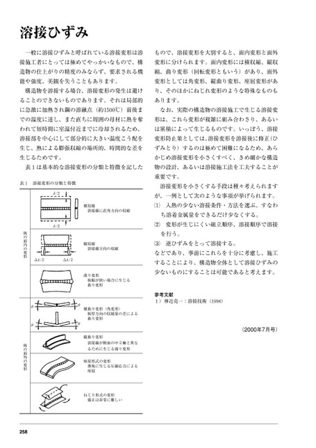 溶接ひずみ一般に溶接ひずみと呼ばれている溶接変形は溶もので、溶接変形を大別すると、面内変形と面外接施工者にとっては極めてやっかいなもので、構変形に分けられます。面内変形には横収縮、縦収造物の仕上がりの精度のみならず、要求される機縮、曲り変形(回転変形ともいう)があり、面外能や強度、美観を失うこともあります。変形としては角変形、縦曲り変形、座屈変形があ構造物を溶接する場合、溶接変形の発生は避けり、そのほかにねじれ変形のような特殊なものもることのできないものであります。それは局部的あります。に急激に加熱され鋼の溶融点(約1500℃)前後まなお、実際の構造物の溶接施工で生じる溶接変での温度に達し、また直ちに周囲の母材に熱を奪形は、これら変形が複雑に組み合わさり、あるいわれて短時間に室温付近までに冷却されるため、は累積によって生じるものです。いっぽう、溶接溶接部を中心にして部分的に大きい温度こう配を変形防止策としては、溶接変形を溶接後に修正(ひ生じ、熱による膨張収縮の場所的、時間的な差をずみとり)するのは極めて困難になるため、あら生じるためです。かじめ溶接変形を小さくすべく、きめ細かな構造表1は基本的な溶接変形の分類と特徴を記した物の設計、あるいは溶接施工法を工夫することが重要です。溶接変形を小さくする手段は種々考えられますが、一例として次のような事項が挙げられます。入熱の少ない溶接条件・方法を選ぶ。すなわち溶着金属量をできるだけ少なくする。変形が生じにくい組立順序、溶接順序で溶接を行う。逆ひずみをとって溶接する。などであり、事前にこれらを十分に考慮し、施工することにより、構造物全体として溶接ひずみの少ないものにすることは可能であると考えます。参考文献1)神近亮一:溶接技術(1996)(2000年7月号)表1溶接変形の分類と特徴δ/2δ/2横収縮溶接線に直角方向の収縮縦収縮溶接線方向の収縮ΔL/2ΔL/2θθ曲り変形板幅が狭い場合に生じる曲り変形θθ横曲り変形(角変形)板厚方向の収縮量の差による曲り変形縦曲り変形溶接線が断面の中立軸と異なるために生じる曲り変形座屈形式の変形薄板に生じる圧縮応力による座屈ねじり形式の変形矯正は非常に難しい板の面内の変形板の面外の変形258