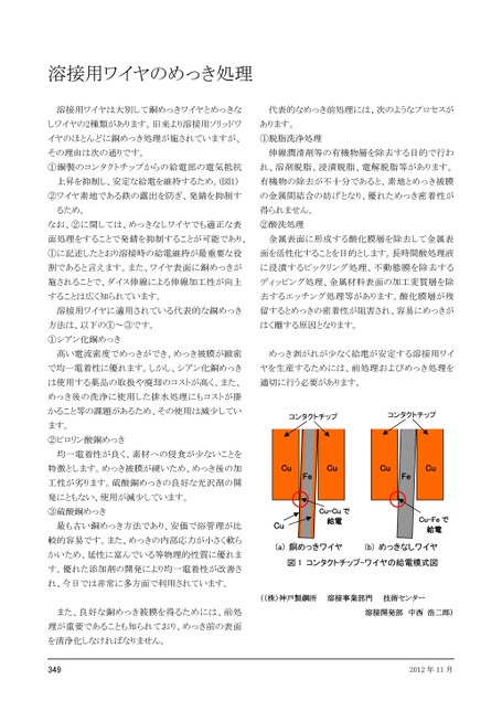 溶接用ワイヤのめっき処理溶接用ワイヤは大別して銅めっきワイヤとめっきな代表的なめっき前処理には、次のようなプロセスがしワイヤの2種類があります。旧来より溶接用ソリッドワあります。イヤのほとんどに銅めっき処理が施されていますが、①脱脂洗浄処理その理由は次の通りです。伸線潤滑剤等の有機物層を除去する目的で行わ①銅製のコンタクトチップからの給電部の電気抵抗れ、溶剤脱脂、浸漬脱脂、電解脱脂等があります。上昇を抑制し、安定な給電を維持するため。(図1)有機物の除去が不十分であると、素地とめっき被膜②ワイヤ素地である鉄の露出を防ぎ、発錆を抑制すの金属間結合の妨げとなり、優れためっき密着性がるため。得られません。なお、②に関しては、めっきなしワイヤでも適正な表②酸洗処理面処理をすることで発錆を抑制することが可能であり、金属表面に形成する酸化膜層を除去して金属表①に記述したとおり溶接時の給電維持が最重要な役面を活性化することを目的とします。長時間酸処理液割であると言えます。また、ワイヤ表面に銅めっきがに浸漬するピックリング処理、不動態膜を除去する施されることで、ダイス伸線による伸線加工性が向上ディッピング処理、金属材料表面の加工変質層を除することは広く知られています。去するエッチング処理等があります。酸化膜層が残溶接用ワイヤに適用されている代表的な銅めっき留するとめっきの密着性が阻害され、容易にめっきが方法は、以下の①~③です。はく離する原因となります。①シアン化銅めっき高い電流密度でめっきができ、めっき被膜が緻密めっき剥がれが少なく給電が安定する溶接用ワイで均一電着性に優れます。しかし、シアン化銅めっきヤを生産するためには、前処理およびめっき処理をは使用する薬品の取扱や廃却のコストが高く、また、適切に行う必要があります。めっき後の洗浄に使用した排水処理にもコストが掛かること等の課題があるため、その使用は減少しています。②ピロリン酸銅めっき均一電着性が良く、素材への侵食が少ないことを特徴とします。めっき被膜が硬いため、めっき後の加工性が劣ります。硫酸銅めっきの良好な光沢剤の開発にともない、使用が減少しています。③硫酸銅めっき最も古い銅めっき方法であり、安価で浴管理が比較的容易です。また、めっきの内部応力が小さく軟らかいため、延性に富んでいる等物理的性質に優れます。優れた添加剤の開発により均一電着性が改善され、今日では非常に多方面で利用されています。コンタクトチップコンタクトチップCuFeCuCuFeCuCu-Cuで給電CuCu-Feで給電(a)銅めっきワイヤ(b)めっきなしワイヤ図1コンタクトチップ-ワイヤの給電模式図((株)神戸製鋼所溶接事業部門技術センター溶接開発部中西浩二郎)2012年11月また、良好な銅めっき被膜を得るためには、前処理が重要であることも知られており、めっき前の表面を清浄化しなければなりません。493