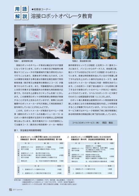 写真1.座学教育の例写真2.実技教育の例溶接ロボットのオペレータ育成は最近ますます重要になってきています。ロボットの教示及び検査等の業務はマニピュレータの可動領域内で動力源を切らないで行うこともあり、危険を伴う作業となります。これらの業務を実施する専任者は労働安全衛生規則で特別教育実施(教示等又は検査等の業務の2コース)が義務づけられています。また、可動範囲内の上記専任者と共同で作業する可動範囲外の作業者も特別教育が必要です。その法令上必要なカリキュラムを表1に示します。この産業用ロボットの特別教育は事業者が実施することが法令上定められていますが、実際には公的機関やロボットメーカーが代行実施して特別教育修了証を発行していることがほとんどです。この内、ロボットメーカーが実施するオペレータ教育(通称ロボットスクールの各種メニューの一つ)はロボット操作の習得が主目的ですが通常は上記特別教育も含んでいます。教示作業向けコースの代表例としては基本コース(教示向け特別教育+メーカー専用の表1.安全衛生特別教育規程操作教育をセットで2日程度)と応用コース(基本コースに加えて、パソコンからのデータ入力、前処理工程、施工トラブル対応などを入れて3日程度)から成り立っています。前者は特別教育を含んでいるので受講し修了すれば法令上ロボット操作が出来るコースで、後者は各ロボットメーカーが独自に内容・時間を決めています。この応用コース修了者は基本コースも同時に修了するので鉄骨ロボットのオペレータ向けに一般的によく行われています。コベルコロボットサービス㈱で行われている教習風景を写真1と2に示します。ロボット導入事業者は産業用ロボット特別教育を実施した場合にはその教育実施記録を作成し3年間保管することが義務づけられています。コベルコロボットサービス㈱ではオペレータ教育終了時に教示等業務に係る特別教育の実施記録と修了証をお渡ししています。コベルコロボットサービス(株)岡田雅志1.産業用ロボットの教示等の業務に係る特別教育労働省告示第49号安全衛生特別教育規定第18条2.産業用ロボットの検査等の業務に係る特別教育労働省告示第49号安全衛生特別教育規定第19条科目範囲産業用ロボットに関する知識産業用ロボットの種類、制御方式、駆動方式、各部の構造及び機能並びに取扱いの方法、制御部品の種類及び特性産業用ロボットの検査等の作業に関する知識検査等の作業の方法、検査等の作業の危険性、関連する機械等との連動の方法時間4時間4時間関係法令法、令及び安衛則中の関係条項1時間科目1.産業用ロボットの操作の方法2.産業用ロボットの検査等の作業の方法時間1時間3時間学科教育実技教育科目範囲産業用ロボットに関する知識産業用ロボットの種類、各部の機能及び取扱いの方法産業用ロボットの教示等の作業に関する知識教示等の作業の方法、教示等の作業の危険性、関連する機械等との連動の方法時間2時間4時間関係法令法、令及び安衛則中の関係条項1時間科目1.産業用ロボットの操作の方法2.産業用ロボットの教示等の作業の方法時間1時間2時間学科教育実技教育参考文献:大型構造物ロボット溶接教本(竹内・菅共著、成山堂書店、1998年):神鋼溶接棒だより技術がいど1987年2月号、3月号(㈱神戸製鋼所):産業用ロボットの安全必携(厚生労働省安全課編、中央労働災害防止協会)272017Summer用解語説●知恵袋コーナー溶接ロボットオペレータ教育