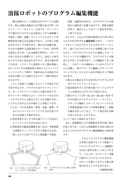 溶接ロボットのプログラム編集機能一般の溶接ロボットは教示点をロボットに記憶溶接・退避等を含めた、そのプログラムの最させ、教示点間を直線または円弧で結ぶPTP(ポ初から最後までを繰り返すので、無駄な動作イント・ツー・ポイント)方式です。ティーチンが多く、場合によってはアーク発生率を著しグの場合はプログラム№を指定してから溶接線へく低下させる。の接近・溶接・退避・ポジショナによるワーク姿などです。これらの不便を解消するために考え勢変更等の教示点を記憶させます。この各々の教られたのがプログラム編集機能であり、一つのワ示点をステップと呼びます。教示点の記憶の後、ークをいくつかのプログラムに分けてティーチンその点で処理する溶接条件やアークON/OFF等グし、後でこれらのプログラムを順番に並べてあを設定しますが、これは命令と呼ばれ、ステップたかも一つのプログラムのように連続してオートの中に含まれる情報です。ただし、設定した命令プレイバックする機能です。このプログラムの集はメモリの中に書込まれますので、命令の数が多まりをブロックと呼びます。この機能をうまく利くなれば、1ステップに必要なメモリ数が増加し用し、一つのワークの溶接をいくつかのプログラます。カタログの記憶容量の項目に○○ワード(○ムに分解し、後でブロックに編集してオートプレ○〜○○ステップ相当)と幅があるのは設定されイバックすることにより上記の不便はすべて解決る命令の数により記憶できるステップ数が変化すされます。るためです。1)教示点の修正もその点を含むプログラムだけこうして作成した連続したステップの集まりがのテストプレイバックでよい。プログラムです。プログラムはテストプレイバッ2)設計変更や少しだけ形の違うワークもプログク、オートプレイバックが行える最小単位です。ラムの組みかえだけですぐ対応できる。オペレーターの好みにより一つのワークを大きな3)図2のようにP1〜Q1,Q1〜Q6,Q6〜R2をそ一つのプログラムで教示することも可能ですが、れぞれ別々のプログラムでティーチングし、こうすると次のような不便なことが起こります。ブロックに編集してオートプレイバックする1)ただ一つの点を修正(変更・追加・削除)すと多層溶接部だけをパス回数分繰返し、無駄るにもテストプレイバックでその点を見つけな動きがまったくなく、アーク発生率を大幅るのに時間と手間がかかる。に向上させることができる。2)設計変更や少しずつ形の違うワークも改めてというぐあいに便利になります。ティーチングしなければならない。また、溶接順序により溶接熱歪み等が違う場合3)溶接条件自動設定機能を用いれば、多層溶接がありますが、これにも溶接順序を自由に組みかも初層のティーチングだけで溶接できるが、えることのできるプログラム編集機能は大変有効図1のように各パスごとに溶接線への接近・です。このようにプログラム編集機能を有効に活用することで溶接ラインのフレキシビリティー(融通性)を高め、効率を著しく向上できます。これらは、オペレーターの腕の見せどころともいえるもので、ロボットを使いこなす上で最も興味のあるところでもあります。(1985年6月号)図1P1〜P10を一つのプログラムでティーチングした時の動き図2プログラムを三つに分割した時の動き158