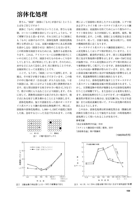 溶体化処理皆さん、“固溶”(固体に「もの」が溶ける)というこ理によって溶接時に析出したクロム炭化物、シグマ相とばをご存じですか?およびフェライト相(オーステナイト系ステンレス鋼液体に「もの」が溶けるということは、皆さんも毎溶接金属は、高温割れを防ぐためにふつう数%のフェ朝、コーヒーに砂糖を溶かしているでしょうから、すライト相を含む)などが固溶して、耐食性、延性、靭ぐ理解できると思いますが、それと同じように固体に性が回復します。この際、溶接による残留応力も除去も「もの」は溶けるのです。溶体化処理(固溶化熱処されます。従って、引張り強度、耐力は低下し、母材理とも呼ばれる)とは、金属の組織の中にある析出物の機械的性質に近くなります。を溶かし込む(固溶させる)操作のことを言います。オーステナイト系ステンレス鋼溶接金属中に、クロこの析出物を固溶させるためには、加熱する必要があム炭化物もしくはシグマ相が析出していますと、とくります。これは、アイスコーヒーには砂糖が溶けにくに低温靭性、耐食性が劣化します。図2に低温衝撃特いのと同じことです。固溶させたものをゆっくり冷や性に及ぼす熱処理の影響を示します。650〜750℃付近してしまうと、再び析出してしまいます。そのために、の加熱では、クロム炭化物およびシグマ相の析出によ水中などに入れて急冷します。実に簡単なことですが、り衝撃値が著しく低下していますが、溶体化処理を行金属材料にとっては重要なことです。ったものは高い衝撃値が得られています。また、図3ここで、もう少し「固溶」について説明します。金に溶着金属の耐食性に及ぼす後熱温度の影響を示しま属は、その原子が格子を組んでできています。この格すが、低温衝撃特性と同様な傾向となります。子の中に他の原子(合金元素)が入り込む方法、つまこのように、溶体化処理を施すことでオーステナイり固溶には、図1に示すような侵入型と置換型がありト系ステンレス鋼溶接金属の性質は改善されます。します。侵入型は固溶する原子が小さい場合(C,Nなど)かし、大型構造物や形状が複雑なものは溶体化処理をで、格子の間に入り込むことにより固溶します。それ行うことが困難ですし、また急冷による変形も発生しに対して、置換型は固溶する原子が大きい場合で、格ます。溶体化処理を行うことができず、かつ低温特性、子点にある原子と置き換わることにより固溶します。耐食性が要求される場合は、安定化鋼(Nb,Vなどを添溶体化処理は、加工や溶接を行った後のオーステナ加)または低炭素鋼を用いて、クロム炭化物の析出をイト系ステンレス鋼の基本的な熱処理です。例えば、抑えるようにします。溶接後の溶体化処理は、1,000〜1,150℃の温度に保持このほか、溶体化処理は析出硬化型合金(微細な析した後、急冷するといった方法で行われます。この処出物を分散させることで強化する合金)の時効処理の前処理として用いられることが有名です。参考文献「改訂金属物理学序論」幸田「ステンレス鋼溶接の実際」應和、田中「溶接棒各論」神戸製鋼所(1985年8月号)0,159806040シャルピー衝撃値J()20