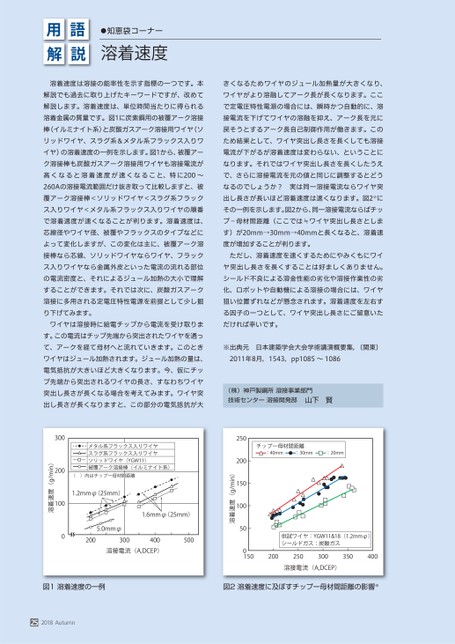 きくなるためワイヤのジュール加熱量が大きくなり、ワイヤがより溶融してアーク長が長くなります。ここで定電圧特性電源の場合には、瞬時かつ自動的に、溶接電流を下げてワイヤの溶融を抑え、アーク長を元に戻そうとするアーク長自己制御作用が働きます。このため結果として、ワイヤ突出し長さを長くしても溶接電流が下がるが溶着速度は変わらない、ということになります。それではワイヤ突出し長さを長くしたうえで、さらに溶接電流を元の値と同じに調整するとどうなるのでしょうか?実は同一溶接電流ならワイヤ突出し長さが長いほど溶着速度は速くなります。図2※にその一例を示します。図2から、同一溶接電流ならばチップ-母材間距離(ここでは≒ワイヤ突出し長さとします)が20mm→30mm→40mmと長くなると、溶着速度が増加することが判ります。ただし、溶着速度を速くするためにやみくもにワイヤ突出し長さを長くすることは好ましくありません。シールド不良による溶金性能の劣化や溶接作業性の劣化、ロボットや自動機による溶接の場合には、ワイヤ狙い位置ずれなどが懸念されます。溶着速度を左右する因子の一つとして、ワイヤ突出し長さにご留意いただければ幸いです。※出典元日本建築学会大会学術講演概要集,(関東)2011年8月,1543,pp1085〜1086(株)神戸製鋼所溶接事業部門技術センター溶接開発部山下賢チップー母材間距離:40mm:30mm:20mm供試ワイヤ:YGW11&18(1.2mmφ)シールドガス:炭酸ガス200250300350400溶接電流(A,DCEP)25020015010050溶着速度(g/min)5001用解語説●知恵袋コーナー溶着速度溶着速度は溶接の能率性を示す指標の一つです。本解説でも過去に取り上げたキーワードですが、改めて解説します。溶着速度は、単位時間当たりに得られる溶着金属の質量です。図1に炭素鋼用の被覆アーク溶接棒(イルミナイト系)と炭酸ガスアーク溶接用ワイヤ(ソリッドワイヤ、スラグ系&メタル系フラックス入りワイヤ)の溶着速度の一例を示します。図1から、被覆アーク溶接棒も炭酸ガスアーク溶接用ワイヤも溶接電流が高くなると溶着速度が速くなること、特に200〜260Aの溶接電流範囲だけ抜き取って比較しますと、被覆アーク溶接棒<ソリッドワイヤ<スラグ系フラックス入りワイヤ<メタル系フラックス入りワイヤの順番で溶着速度が速くなることが判ります。溶着速度は、芯線径やワイヤ径、被覆やフラックスのタイプなどによって変化しますが、この変化は主に、被覆アーク溶接棒なら芯線、ソリッドワイヤならワイヤ、フラックス入りワイヤなら金属外皮といった電流の流れる部位の電流密度と、それによるジュール加熱の大小で理解することができます。それでは次に、炭酸ガスアーク溶接に多用される定電圧特性電源を前提として少し掘り下げてみます。ワイヤは溶接時に給電チップから電流を受け取ります。この電流はチップ先端から突出されたワイヤを通って、アークを経て母材へと流れていきます。このときワイヤはジュール加熱されます。ジュール加熱の量は、電気抵抗が大きいほど大きくなります。今、仮にチップ先端から突出されるワイヤの長さ、すなわちワイヤ突出し長さが長くなる場合を考えてみます。ワイヤ突出し長さが長くなりますと、この部分の電気抵抗が大3002001001.6mmφ(25mm)05.0mmφ200300400500溶接電流(A,DCEP)メタル系フラックス入りワイヤスラグ系フラックス入りワイヤソリッドワイヤ(YGW11)被覆アーク溶接棒(イルミナイト系)()内はチップー母材間距離1.2mmφ(25mm)溶着速度(g/min)図1溶着速度の一例図2溶着速度に及ぼすチップー母材間距離の影響※252018Autumn