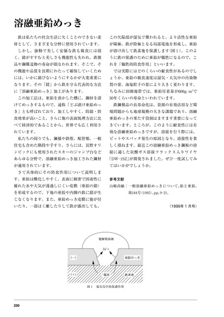 溶融亜鉛めっき鉄は私たちの社会生活に欠くことのできない素この欠陥部が湿気で覆われると、より活性な亜鉛材として、さまざまな分野に使用されています。が陽極、鉄が陰極となる局部電池を形成し、亜鉛しかし、強靭で美しく安価な鉄も腐食には弱が溶け出して鉄素地を保護します(図1)。このよく、錆がすすむと美しさも機能性も失われ、鉄製うに鉄の保護のために亜鉛が犠牲になるので、こ品や鋼構造物の寿命が損なわれます。そこで、それを「犠牲的防食作用」といいます。の機能や品質を長期にわたって確保していくためでは実際にはどのくらいの耐食性があるのでしには、いかに錆びないようにするかが大変重要にょうか。亜鉛の腐食速度は湿気・大気中の汚染物なります。その「錆」から鉄を守る代表的な方法質の量、海塩粒子の量により大きく変わります。に「溶融亜鉛めっき」加工があります。ちなみに田園地帯では、亜鉛付着量が600g/m2でこの加工法は、亜鉛を溶かした槽に、鋼材を漬50年くらいの寿命といわれています。けてめっきするもので、通称「どぶ漬け亜鉛めっ鉄鋼製品の長寿命化は、資源の有効活用など環き」とも呼ばれており、加工しやすく、防錆・防境問題からも地球規模の大きな課題であり、溶融食効果が高いこと、さらに他の表面処理方法に比亜鉛めっきの果たす役割はますます重要になってべて経済的であることから、世界でも広く利用さきています。ところが、このように耐食性には有れています。効な溶融亜鉛めっきですが、溶接を行う際には、私たちの周りでも、鋼橋や鉄塔、配管類、一般ピットやスパッタ発生の原因となり、溶接性を著住宅も含めた階段や手すり、さらには、長野オリしく損ねます。最近この溶融亜鉛めっき鋼板の溶ンピックにも使用されたスキーのジャンプ台など接に適した炭酸ガス溶接フラックス入りワイヤあらゆる分野で、溶融亜鉛めっき加工された鋼材「DW―1SZ」が開発されました。ぜひ一度試してみが適用されています。てはいかがでしょうか。さて具体的にその防食作用について説明します。亜鉛は酸化しやすく、表面に緻密で固着性に参考文献優れた水や大気が透過しにくい皮膜(亜鉛の錆)山崎尚敏:一般溶融亜鉛めっきについて、鉛と亜鉛、を形成するので、下地の亜鉛や内側の鉄に錆が生第184号(1995),pp.9―21.じなくなります。また、亜鉛めっき皮膜に傷が付いたり、一部はく離したりして鉄が露出しても、(1999年1月号)図1電気化学的保護作用230