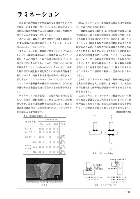 ラミネーション溶接継手部の断面マクロ組織を見る機会の多い人の次に、ラミネーションが溶接構造物に及ぼす影響に中には、いままでに一度ぐらい、写真1に示すようについて述べたいと思います。母材部に線状の模様の入った試験片に出合った経験の一般に圧延鋼板においては、板厚方向の強度は圧延持主もいるのではないでしょうか。方向および圧延と直角方向の強度に比較して低いといこのように、鋼板の圧延方向に平行に薄く層状に存う異方性を持つ傾向があります。前記のように、ラミ在する鋼板の内部欠陥のことを“ラミネーションネーションは鋼板を板厚方向に不連続にするような欠(Lamination)”といいます。陥であるために、この異方性の傾向はさらに助長されラミネーションは、製鋼時に発生したパイプや混入ることになり、図1に示すようなT形や十字形継手をしたゴミ(脱酸生成物あるいは微細な耐火材など)に多用する溶接構造物においては、ラミネーションの存起因したものが多く、これらの混入物が圧延によって在によって、思わぬ低強度で破壊が生じる危険性があ薄く層状に引きのばされたために、写真1のように線ります。また、厚板の継手のように、圧延鋼板の板厚状模様として見えているものです。そのために、通常方向に大きな拘束を受ける場合には、図2に示すよう欠陥内部には酸化物や硫化物などの非金属介在物を含なラメラティア(層状はく離割れ)発生の一因ともな有しています。内在する非金属介在物の一例を表1にります。示しますが、ラミネーションにおいては、特にマンガさらに、ラミネーションの存在は鋼板の疲労強度にンシリケート系酸化物や硫化物(MnSなど)などの延も大きな影響を与え、欠陥が大きい場合には、健全な伸性のある非金属介在物の存在が大きな影響を与えま材料と比較して疲労寿命が百分の一以下となるようなす。例もあります。ラミネーションは形態的に、圧延方向に平行に存在以上のように、ラミネーションは構造物において極しているために鋼板表面からこれを見い出すことは困めて有害な影響を与える欠陥と考えられますので、鋼難ですが、近年の非破壊検査法の進歩により、例えば板の選定にあたっては、前述の超音波探傷法などを用超音波探傷法(UT)などを使用すれば、十分にその存いて、十分な調査を行っておくことが必要でしょう。在を知ることが可能です。(1982年6月号)表1代表的介在物の一例介在物種類化学組成(%)SiO2AlO23MnOその他アルミネートMnシリケート15〜2060〜7010〜1530〜4015〜2030〜50――Caシリケート40〜50〜10〜10ZrO220〜40〜510〜20CrO210〜2020〜3010〜20TiO230〜40〜520〜30スペシャルシリケートCaO〜50302ZrO〜50602CrO〜306022TiO〜2030写真1165