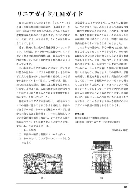 リニアガイド/LMガイド最初にお断りしておきますが、「リニアガイド」と定義することができます。このような特徴かとは日本精工株式会社の商品名、「LMガイド」とら、リニアガイドは、ユニットとして適切な精度はTHK株式会社の商品名であり、どちらも転がり・剛性で製作することができ、その結果、使用者直動案内軸受けのことを指します。以下の記述では、特別な作業をすることなく、そのユニットをは、代表して「リニアガイド」という表記を用い直接機械に取付けることにより、容易に高精度なることにします。案内を得ることができるようになりました。近年、機械の省人化や自動化が進む中で、ロボこのような特性から、多くの機械で急速に使わット、FA機器、小・中型のNC施盤やマシニングれるようになったリニアガイドですが、その使用センタなどの直線案内機構には、従来のすべり案に際して全く注意を払わなくても良いと言うわけ内に代わって、転がり案内が多く使われるようにではありません。その一つがベアリング内への異なっています。物の侵入です。レールがベアリングの外に露出しすべりを転がりに置き換える試みは、古く先史ているため、レールに付着した異物が転動体の隙時代から見られ、エジプトの壁画にも大きな石の間に入り込むことがあります。この異物は、摩耗下に丸太を敷き転がしながら軽く動かしている様を促進し、精度を劣化させます。異物侵入の対策子が描かれています(図1)。この絵では、特に、としては、レールを蛇腹やテレスコピックで覆っ後ろ側の丸太を順次、前側に運ぶ様子も描かれててしまうという方法や、レールとベアリングの隙います。このように、人は古代から直感的にすべ間をシールしてしまって、ベアリング内への異物りを転がりに置き換えることにより重量物を軽くの侵入を遮断するという方法があります。以前に動かすことを知っていました。比べて、最近はシールの性能がどんどん向上して現在のリニアガイドの基本形は、1932年のフラきており、これからますます様々な場面でのリニンスの特許に見ることができます(図2)。転動体アガイドの使用が期待されるところです。であるボールは、レールと接触しベアリングに掛かる負荷を支える負荷圏と、レールに接触してい参考文献ない非負荷圏を循環しながら、レールがある限り日本精工株式会社精機開発技術部無限にベアリングを移動させることができます。山口利明「精密リニアガイドの機能と特徴」すなわち、リニアガイドとは、レール案内転動体が循環し無限ストロークを持つレールとベアリングが一つのユニットになったもの(1999年4月号)図1図2231