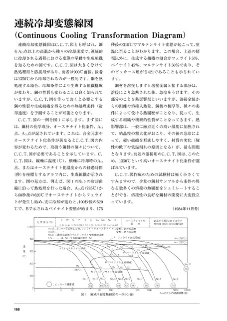 連続冷却変態線図(ContinuousCoolingTransformationDiagram)連続冷却変態線図はC.C.T.図とも呼ばれ、鋼秒後の310℃でマルテンサイト変態が起こって、室をAC3点以上の高温から種々の冷却速度で、連続的温に至ることがわかります。この場合、上述の情に冷却される過程における変態の挙動や生成組織報以外に、生成する組織の割合がフェライト5%、を知るための図です。C.C.T.図は大きく分けてベイナイト45%、マルテンサイト50%であり、そ熱処理用と溶接用があり、前者は900℃前後、後者のビッカース硬がさ421であることも示されていは1350℃から冷却されるのが一般的です。鋼を熱ます。処理する場合、冷却条件により生成する組織構成鋼材を溶接しますと溶接金属と接する部分は、が変わり、鋼の性質も変わることは良く知られて溶接により急熱された後、急冷をうけます。そのいますが、C.C.T.図を作っておくと必要とする部分のことを熱影響部といいますが、溶接金属か鋼の性質や生成組織を得るための熱処理条件(冷らの距離や溶接入熱量、鋼板の板厚等、種々の条却速度)を予測することが可能となります。件によって受ける熱履歴がことなり、従って、生C.C.T.図の一例を図1に示します。まず図に成する組織や機械的性質がことなってきます。熱は、鋼材の化学成分、オーステナイト化条件、AC3影響部は、一般に融点近くの高い温度に加熱され点、AC1点が記されています。これは、合金元素やて、結晶粒の粗大化がおこり、その後の急冷によオーステナイト化条件が異なるとC.C.T.図の内って、硬い組織を形成しやすく、材質の劣化(靱容が変わるためで、取扱う鋼種の個々について、性の低下や低温割れの原因となる)が、最も問題C.C.T.図が必要であることを示しています。C.となります。前述の溶接用のC.C.T.図は、このたC.T.図は、縦軸に温度(℃)、横軸に冷却時のAC3め、1350℃という高いオーステナイト化条件が選点、またはオーステナイト化温度からの経過時間ばれています。(秒)を座標とするグラフ内に、生成組織が示されC.C.T.図作成のための試験材は極く小さくてます。図の見方は、例えば、図1の№5の冷却曲すみますので、少量の鋼材サンプルから条件の異線に沿って熱処理を行った場合、AC3点(785℃)かなる数多くの溶接の熱履歴をシュミレートするこら60秒後の620℃でオーステナイトからフェライとができ、溶接性の良好な鋼材の開発に大変役立トが発生し始め、更に冷却が進むと、100秒後の520っています。℃で、Bで示されるベイナイト変態が始まり、175(1984年11月号)168