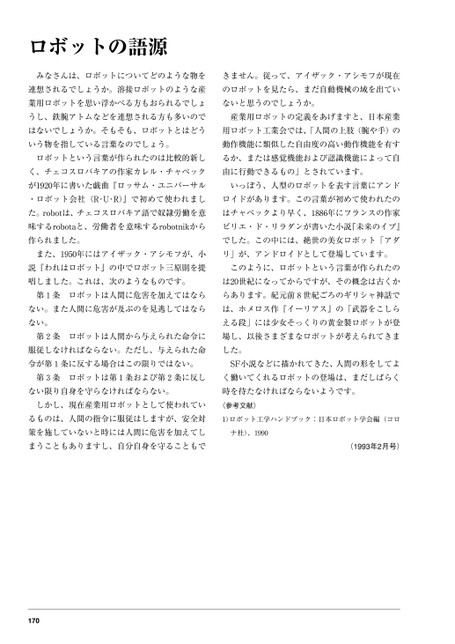 ロボットの語源みなさんは、ロボットについてどのような物をきません。従って、アイザック・アシモフが現在連想されるでしょうか。溶接ロボットのような産のロボットを見たら、まだ自動機械の域を出てい業用ロボットを思い浮かべる方もおられるでしょないと思うのでしょうか。うし、鉄腕アトムなどを連想される方も多いので産業用ロボットの定義をあげますと、日本産業はないでしょうか。そもそも、ロボットとはどう用ロボット工業会では、「人間の上肢(腕や手)のいう物を指している言葉なのでしょう。動作機能に類似した自由度の高い動作機能を有すロボットという言葉が作られたのは比較的新しるか、または感覚機能および認識機能によって自く、チェコスロバキアの作家カレル・チャペック由に行動できるもの」とされています。が1920年に書いた戯曲『ロッサム・ユニバーサルいっぽう、人型のロボットを表す言葉にアンド・ロボット会社(R・U・R)』で初めて使われましロイドがあります。この言葉が初めて使われたのた。robotは、チェコスロバキア語で奴隷労働を意はチャペックより早く、1886年にフランスの作家味するrobotaと、労働者を意味するrobotnikからビリエ・ド・リラダンが書いた小説『未来のイブ』作られました。でした。この中には、絶世の美女ロボット「アダまた、1950年にはアイザック・アシモフが、小リ」が、アンドロイドとして登場しています。説『われはロボット』の中でロボット三原則を提このように、ロボットという言葉が作られたの唱しました。これは、次のようなものです。は20世紀になってからですが、その概念は古くか第1条ロボットは人間に危害を加えてはなららあります。紀元前8世紀ごろのギリシャ神話でない。また人間に危害が及ぶのを見逃してはならは、ホメロス作『イーリアス』の「武器をこしらない。える段」には少女そっくりの黄金製ロボットが登第2条ロボットは人間から与えられた命令に場し、以後さまざまなロボットが考えられてきま服従しなければならない。ただし、与えられた命した。令が第1条に反する場合はこの限りではない。SF小説などに描かれてきた、人間の形をしてよ第3条ロボットは第1条および第2条に反しく働いてくれるロボットの登場は、まだしばらくない限り自身を守らなければならない。時を待たなければならないようです。しかし、現在産業用ロボットとして使われてい〈参考文献〉るものは、人間の指令に服従はしますが、安全対1)ロボット工学ハンドブック:日本ロボット学会編(コロ策を施していないと時には人間に危害を加えてしナ社)、1990まうこともありますし、自分自身を守ることもで(1993年2月号)170