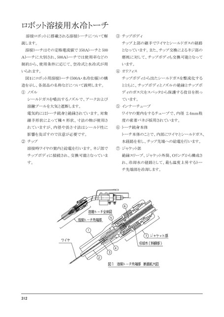 ロボット溶接用水冷トーチ溶接ロボットに搭載される溶接トーチについて解③チップボディ説します。チップ上部の継手でワイヤとシールドガスの経路溶接トーチはその定格電流値で350Aトーチと500となっています。また、チップ交換によるネジ部のAトーチに大別され、500Aトーチでは使用率などの磨耗に対して、チップボディも交換可能となって制約から、使用条件に応じて、空冷式と水冷式が用います。いられます。④オリフィス図1にロボット用溶接トーチ(500A・水冷仕様)の構チップボディから出たシールドガスを整流化する造を示し、各部品の名称などについて説明します。とともに、チップボディとノズルの絶縁とチップボ①ノズルディのガス穴をスパッタから保護する役目を担っシールドガスを噴出するノズルで、アークおよびています。溶融プールを大気と遮断します。⑤インナーチューブ電気的にはトーチ銃身と絶縁されています。対象ワイヤの案内をするチューブで、内径2.4mm程継手形状によって種々形状、寸法の物が使用さ度の密着バネが採用されています。れていますが、内径や長さ寸法はシールド性に⑥トーチ銃身本体影響を及ぼすので注意が必要です。トーチ本体のことで、内部にワイヤとシールドガス、②チップ水経路を有し、チップ先端への給電を行います。溶接時ワイヤの案内と給電を行います。ネジ部で⑦ジャケット部チップボディに接続され、交換可能となっていま絶縁スリーブ、ジャケット外筒、Oリングから構成さす。れ、冷却水の経路として、最も温度上昇するトーチ先端部を冷却します。123