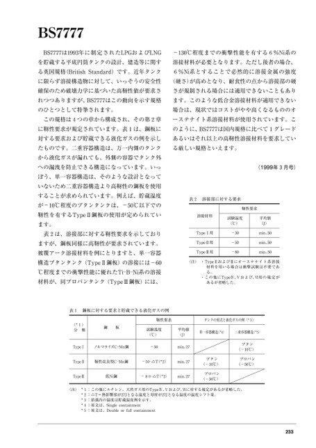 BS7777BS7777は1993年に制定されたLPGおよびLNG-130℃程度までの衝撃性能を有する6%Ni系のを貯蔵する平底円筒タンクの設計、建造等に関す溶接材料が必要となります。ただし後者の場合、る英国規格(BritishStandard)です。近年タンク6%Ni系とすることで必然的に溶接金属の強度に限らず溶接構造物に対して、いっそうの安全性(硬さ)が高めとなり、耐食性の点から溶接部の硬確保のため破壊力学に基づいた高靭性値が要求ささが規制される場合には適用できないこともありれつつありますが、BS7777はこの動向を示す規格ます。このような低合金溶接材料が適用できないのひとつとして特筆されます。場合は、現状ではコストがやや高くなるもののオこの規格は4つの章から構成され、その第2章ーステナイト系溶接材料が使用されています。こに靭性要求が規定されています。表1は、鋼板にのように、BS7777は国内規格に比べて1グレード対する要求および貯蔵できる液化ガスの例を示しあるいはそれ以上の高靭性溶接材料を要求していたものです。二重容器構造は、万一内側のタンクる厳しい規格といえます。から液化ガスが漏れても、外側の容器でタンク外への漏洩を防止できる構造になっています。いっぽう、単一容器構造は、そのような設計となっていないため二重容器構造より高靭性の鋼板を使用することが求められています。例えば、貯蔵温度が-10℃程度のブタンタンクは、-50℃以下での靭性を有するTypeⅡ鋼板の使用が定められています。表2は、溶接部に対する靭性要求を示しておりますが、鋼板同様に高靭性が要求されています。被覆アーク溶接材料を例にとりますと、単一容器構造ブタンタンク(TypeⅡ鋼板)の溶接には-60℃程度までの衝撃性能に優れたTi―B―Ni系の溶接材料が、同プロパンタンク(TypeⅢ鋼板)には、(1999年3月号)表2溶接部に対する要求靭性要求溶接材料TypeⅠ用TypeⅡ用TypeⅢ用試験温度(℃)-30-50-80平均値(J)min.50min.50min.50(注)・TypeⅡおよびⅢにオーステナイト系溶接材料を用いる場合は衝撃試験は不要である。・この他にTypeⅣ,Ⅴおよび、Ⅵ用の規定があるが省略した。表1鋼板に対する要求と貯蔵できる液化ガスの例(*1)類分鋼板靭性要求タンクの形式と液化ガスの例(*3)試験温度(℃)平均値(J)単一容器構造(*4)二重容器構造(*5)TypeⅠノルマライズC―Mn鋼-50min.27TypeⅡ靭性改良型C―Mn鋼-50―△T(*2)min.27TypeⅢ低Ni鋼-80―△T(*2)min.27ブタン(-10℃)プロパン(-50℃)ブタン(-10℃)プロパン(-50℃)(注)*1:この他にエチレン、天然ガス用のTypeⅣ,Ⅴおよび、Ⅵに対する規定があるが省略した。*2:△T=熱影響部が27Jとなる温度と母材が27Jとなる温度の温度シフト量。*3:括弧内の温度は貯蔵温度例を示す。*4:原文は、Single*5:原文は、Doublecontainmentcontainmentorfull233