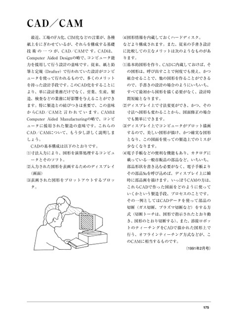 CAD/CAM最近、工場のFA化、CIM化などの言葉が、各種図形情報を内蔵しておくハードディスク。紙上をにぎわせているが、それらを構成する基礎などより構成されます。また、従来の手書き設計技術の一つが、CAD/CAMです。CADは、に比較しての主なメリットは次のようなものがあComputerAidedDesignの略で、コンピュータ能力を援用して行う設計の意味です。従来、紙と鉛ります。基本的図形を作り、CADに内蔵しておけば、そ筆と定規(Drafter)で行われていた設計がコンピの図形は、呼び出すことで何度でも使え、かつュータを使って行われるもので、多くのメリット組合せることで、他の図形を作ることができるを持った設計手段です。このCAD化をすることにので、手書きの設計の場合のようにいちいち、より、単に設計業務だけでなく、営業、生産、製すべて最初から図形を描く必要がなく、設計時造、検査などの業務に好影響を与えることができ間短縮となります。ます。特に製造との結びつきは重要で、この意味ディスプレイ上で寸法変更ができ、かつ、そのからCAD/CAMと言われています。CAMは寸法へ図形も変わることから、図面修正の場合ComputerAidedManufacturingの略で、コンピでも簡単にできます。ュータに援用された製造の意味です。これらのディスプレイ上でコンピュータがプロット描画CAD/CAMについて、もう少し詳しく説明しまするので、美しい図形が描け、かつ確実な図形しょう。となり、この図面を使っての製造上でのミスがCADの基本構成は以下のとおりです。少なくなります。寸法入力により、図形を演算処理するコンピュ電子手帳などの便利な機能もあり、カタログにータとそのソフト。載っている一般市販品の部品など、いちいち、入力された図形を表画するためのディスプレイ部品形状を書き込む必要がなく、電子手帳より(画面)その部品№を呼び込めば、ディスプレイ上に瞬表画された図形をプロットアウトするプロッ時に部品画を描けます。いっぽうCAMの方は、タ。これらCADで作った図面をどのように使っていくかという製造手段、プロセスのことです。その一例としてはCADデータを使って部品の切断(ガス切断、プラズマ切断など)をする方式(切断トーチは、図形で指示されたとおり動き、図形のとおり切断する)、また、溶接ロボットのティーチングをCADで描かれた図形上で行う、オフラインティーチング方式などが、このCAMに相当するものです。(1991年2月号)175