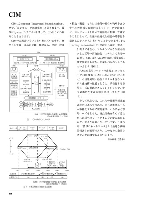 CIMCIMはComputerIntegratedManufacturingの・製造・販売、さらには企業の経営や戦略を含む略で、「コンピュータ統合生産」と訳されます。最すべての情報を有機的にネットワークで結合さ後にSystem(システム)を付して、CIMSといわれせ、コンピュータを用いて統括的に制御・管理することもあります。ることによって、生産の最適化と経営の効率化をCIMの定義はいろいろといわれていますが、概意図したシステム」ということができます。FA念としては「商品の企画・開発から、受注・設計(FactoryAutomation)が「受注から設計・製造・出荷までを含む、フレキシブルな生産を指向した工場一貫自動化システム」であるのに対し、CIMはさらに経営管理、営業戦略、研究開発をも含む、企業レベルのシステムといえます(図1)。FAは産業用ロボットの普及と、コンピュータ利用技術(CAD・CAM・CAT・CAEなど)や情報処理・通信システムを含むシステム化技術の進展とともに、多様化する市場ニーズに対応できるフレキシブルで、かつ効率的な生産体制を実現しました(図2)。そして現在では、これらの技術革新は加速度的に進みつつあり、さらに市場ニーズが多様化する中で製造業は、いかに早く市場ニーズをとらえ、商品開発を含めて受注から市場へのリードタイムをいかに縮めるかが、大きな課題となっています。とりわけ、「情報のネットワーク」と「迅速な戦略的経営」が重要であり、このための企業システムがCIMであるといえます。(1991年10月号)CIM(本社)経営システム(営業所)販売情報システム製品計画、システム計画、投資計画マーケティング、販売計画、受注管理(本社)財務システム財務資金計画(購入先)見積り管理受・発注管理工程・納入管理物流管理(工場)受注データベース生産管理情報システム生産負荷計画日程計画進度管理治工具管理生産・技術情報システム製品設計生産設計設備運転・制御品質管理工場情報ネットワーク製品出荷検査組立加工倉庫材料投入無人化工場(本社)経理システム経理原価管理予実算管理(研究所)研究開発システム基礎研究応用研究製品開発出典;「CIM生販統合の実現」油井兄朝著、日本経済新聞社刊(1990)図1CIM構成のイメージコンピュータ第2世代(トランジスタ)第3世代(IC)第3.5世代(LSI)第4世代(VLSI)第5世代CAMCADCAD/CAMCAENCフライスDNC/CNCFMC/FMSFA・TotalFA・CIMソフトハードロボットプロトタイプMHSロボット元年第一世代ロボット(繰返し)第二世代ロボット(知覚・判断)第三世代ロボット(学習)195019601970198019902000生産体系合理化レベル少品種多量生産時代多品種少量生産時代変種変量生産時代(点)(線)(面)(体)出典;「CIM生販統合の実現」油井兄朝著、日本経済新聞社刊(1990)図2技術の発展と生産体系の変遷176
