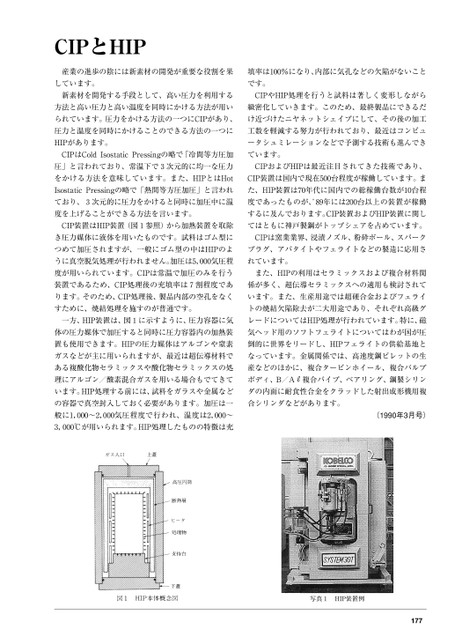 CIPとHIP産業の進歩の陰には新素材の開発が重要な役割を果填率は100%になり、内部に気孔などの欠陥がないことしています。です。新素材を開発する手段として、高い圧力を利用するCIPやHIP処理を行うと試料は著しく変形しながら方法と高い圧力と高い温度を同時にかける方法が用い緻密化していきます。このため、最終製品にできるだられています。圧力をかける方法の一つにCIPがあり、け近づけたニヤネットシェイプにして、その後の加工圧力と温度を同時にかけることのできる方法の一つに工数を軽減する努力が行われており、最近はコンピュHIPがあります。ータシュミレーションなどで予測する技術も進んできCIPはColdIsostaticPressingの略で「冷間等方圧加ています。圧」と言われており、常温下で3次元的に均一な圧力CIPおよびHIPは最近注目されてきた技術であり、をかける方法を意味しています。また、HIPとはHotCIP装置は国内で現在500台程度が稼働しています。まIsostaticPressingの略で「熱間等方圧加圧」と言われた、HIP装置は70年代に国内での総稼働台数が10台程ており、3次元的に圧力をかけると同時に加圧中に温度であったものが、’89年には200台以上の装置が稼働度を上げることができる方法を言います。するに及んでおります。CIP装置およびHIP装置に関しCIP装置はHIP装置(図1参照)から加熱装置を取除てはともに神戸製鋼がトップシェアを占めています。き圧力媒体に液体を用いたものです。試料はゴム型にCIPは窯業業界、浸漬ノズル、粉砕ボール、スパークつめて加圧されますが、一般にゴム型の中はHIPのよプラグ、アパタイトやフェライトなどの製造に応用さうに真空脱気処理が行われません。加圧は5,000気圧程れています。度が用いられています。CIPは常温で加圧のみを行うまた、HIPの利用はセラミックスおよび複合材料関装置であるため、CIP処理後の充填率は7割程度であ係が多く、超伝導セラミックスへの適用も検討されてります。そのため、CIP処理後、製品内部の空孔をなくいます。また、生産用途では超硬合金およびフェライすために、焼結処理を施すのが普通です。トの焼結欠陥除去が二大用途であり、それぞれ高級グ一方、HIP装置は、図1に示すように、圧力容器に気レードについてはHIP処理が行われています。特に、磁体の圧力媒体で加圧すると同時に圧力容器内の加熱装気ヘッド用のソフトフェライトについてはわが国が圧置も使用できます。HIPの圧力媒体はアルゴンや窒素倒的に世界をリードし、HIPフェライトの供給基地とガスなどが主に用いられますが、最近は超伝導材料でなっています。金属関係では、高速度鋼ビレットの生ある複酸化物セラミックスや酸化物セラミックスの処理にアルゴン/酸素混合ガスを用いる場合もでてきています。HIP処理する前には、試料をガラスや金属など産などのほかに、複合タービンホイール、複合バルブボディ、B/A複合パイプ、ベアリング、鋼製シリンダの内面に耐食性合金をクラッドした射出成形機用複の容器で真空封入しておく必要があります。加圧は一合シリンダなどがあります。般に1,000〜2,000気圧程度で行われ、温度は2,000〜3,000℃が用いられます。HIP処理したものの特徴は充(1990年3月号)写真1HIP装置例177