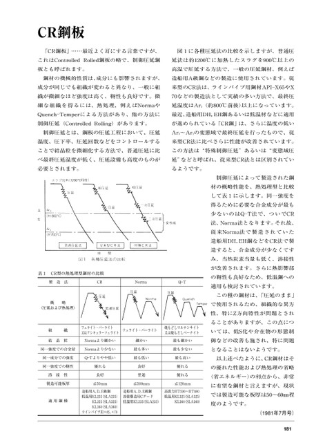 CR鋼板「CR鋼板」……最近よく耳にする言葉ですが、図1に各種圧延法の比較を示しますが、普通圧これはControlledRolled鋼板の略で、制御圧延鋼延法は約1200℃に加熱したスラグを900℃以上の板とも呼ばれます。高温で圧延する方法で、一般の圧延鋼材、例えば鋼材の機械的性質は、成分にも影響されますが、造船用A級鋼などの製造に使用されています。従成分が同じでも組織が変わると異なり、一般に組来型のCR法は、ラインパイプ用鋼材API―X65やX織が微細なほど強度は高く、靭性も良好です。微70などの製造法として実績の多い方法で、最終圧細な組織を得るには、熱処理、例えばNormaや延温度はAr3(約800℃前後)以上になっています。Quench―Temperによる方法があり、他の方法に最近、造船用DH,EH鋼あるいは低温材などに適用制御圧延(ControlledRolling)があります。が進められている「CR鋼」は、さらに温度の低い制御圧延とは、鋼板の圧延工程において、圧延Ar3〜Ar1の変態域で最終圧延を行ったもので、従温度、圧下率、圧延回数などをコントロールする来型CR法に比べさらに性能が改善されています。ことで結晶粒を微細化する方法で、普通圧延に比この方法は“特殊制御圧延”あるいは“変態域圧べ最終圧延温度が低く、圧延設備も高度のものが延”などと呼ばれ、従来型CR法とは区別されてい必要とされます。゛るようです。表1CR型の熱処理型鋼材の比較製造法CRNormaQ-T概および略熱処理)(圧延組織結晶粒同一強度での合金量・フェライト又パはアシキュラーーライトフェライトNormaより細かいNormaより少ないフェライト・パーライト焼又もどしマルテンサイトはナイトもどしベ焼ー細かい最も多い最も細かい最も少ない同一成分での強度Q-T同一強度での靭性よりやや低い最も低い最も高い優れる良好≦50mm良好普通優れる優れる≦300mm≦120mm溶接性製造可能板厚適用鋼種造船用低温用ラインパイプ用×A.KLKLKLDE.235325(36級鋼SLASLASLA65.)))235325360×70級鋼.A造船用D.C溶接構造用低温用235Eグ(KLドーSLA235)高張力低温用HTKLKL590325360〜HTSLASLA980325360))制御圧延によって製造された鋼材の概略性能を、熱処理型と比較して表1に示します。同一強度を得るために必要な合金成分が最も少ないのはQ―T法で、ついでCR法、Norma法となります。それ故、従来Norma法で製造されていた造船用DH,EH鋼などをCR法で製造すると、合金成分が少なくてすみ、当然炭素当量も低く、溶接性が改善されます。さらに熱影響部の靭性も良好なため、低温鋼への適用も検討されています。この種の鋼材は、「圧延のまま」で使用されるため、組織的な異方性、特にZ方向特性が問題とされることがありますが、この点については、低S化や介在物の形態制御などの改善も施され、特に問題となることはないようです。以上述べたように、CR鋼材はその優れた性能および熱処理の省略(省エネルギー)の利点から、非常に有望な鋼材と言えますが、現状では製造可能な板厚は50〜60㎜程度のようです。(1981年7月号)181