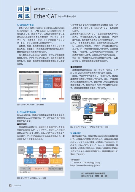 用解語説●知恵袋コーナーEtherCAT(イーサキャット)1.EtherCATとはEtherCAT(EthernetforControlAutomationTechnology)は、LAN(LocalAreaNetwork)の代名詞として、家庭やオフィスなどで使われているEthernetと互換性のある産業用オープンフィールドネットワーク規格の一つで、ドイツの企業ベッコフオートメーションが開発した技術です[1]。省配線、高速、高精度同期など数多くのメリットがあるため、自動車メーカの生産工場で採用されるなど、産業用途で広く利用されています。広く普及しているEthernetのハードウェアの構成を維持しつつ、ソフトウェアにおいて、独自の仕組みを採用して、高速・高精度な同期通信を実現しています(図1)。ハードウェアブロック図ソフトウェアイメージ図標準プロトコルアプリケーションTCPUPDIPIndustrialEthernetプロトコルEthernetコントローラ専用コントローラ(EtherCATSlaveController)MCUEthernetMACEthernetPHYPulseTransRJ45コネクタEthernetEtherCATEthernetEtherCAT図1EtherCATプロトコルの概要2.EtherCATの特長EtherCATには、高速かつ高精度な同期性能を備えた産業用Ethernetを実現する上で、以下のような技術的特長があります。●高速通信高速通信の実現には、接続された機器がデータを送受信する方法として、オンザフライ方式という技術が採用されています(図2)。EtherCATでは以下のような手順で、データが通過中にその中身を読みとり、書き加えることで実施されます。マスタスレーブ1スレーブ2スレーブnデータ交換OUTINデータ交換OUTINデータ交換OUTINECATヘッダスレーブ1データワーキングカウンタECATヘッダスレーブ2データワーキングカウンタECATヘッダスレーブnデータワーキングカウンタデータグラム1データグラム2データグラムnイーサネットヘッダEtherCATデータFCS:CRCパケット間隔IPGEtherCATフレーム1.司令塔であるマスタが接続される各機器(スレーブと呼ばれる)に対して、EtherCATフレームを送信します。2.送信されたEtherCATフレームは接続されたすべてのスレーブを順次通過して、最下流のスレーブまで届いた後、折り返されて再びマスタに戻ります。3.スレーブを通過する際に、送信されたEtherCATフレームに対して各スレーブがデータを読み書きすることで、データの交換を実現しています。この方式では、一つのフレームをマスタとすべてのスレーブの通信で使用します。これによりマスタと各スレーブが一対一で通信するよりも送受信するフレーム数が少なく、効率的な通信が実現できます。●高精度同期高精度同期の実現には、DC(ディストリビュートクロック)という技術が採用されています(図3)。DCは、マスタがすべてのスレーブに対して、共通の基準時間を通知して実現しています。スレーブは通知された基準時間に対して、内部で持っている時間との差異を考慮して、動作するタイミングを調整することで、高度な時刻同期を可能にしています。マスタの時刻マスタ基準時間を共有する機能を持つスレーブDC機能を持つスレーブスレーブ1スレーブ2スレーブnスレーブ1の時刻(=基準時間)図3ディストリビュートクロックのイメージ図3.おわりに神戸製鋼所では、溶接に関わるさまざまな装置を用いて、お客様のご要望に応えるべく、多種多様な溶接ロボットシステムをご提案・ご提供しております。その中で、EtherCATはマニピュレータ、周辺装置、溶接電源との通信に活用され、高速かつ高精度に同期させるリアルタイム制御を可能にし、溶接品質の向上に貢献しています。(参考文献)[1]EtherCATTechnologyGrouphttps://www.ethercat.org/jp.htm図2オンザフライ処理のイメージ図溶接システム部252025Winter(株)神戸製鋼所溶接事業部門金尾顕一朗