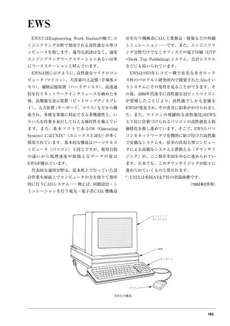 EWSEWSとはEngineeringWorkStationの略で、エ計を行う機械系CAD,工業製品・建築などの外観ンジニアリング分野で使用される高性能な小型コシミュレーション――です。また、エンジニアリンピュータを指します。適当な訳語はなく、通常ング分野だけでなくオフィスでの電子印刷(DTPエンジニアリングワークステーションあるいは単=DeskTopPublishing)システム、会計システムにワークステーションと呼んでいます。などにも用いられています。EWSは図に示すように、高性能なマイクロコンEWSは1973年にコピー機で有名な米ゼロックピュータ(マイコン)、大容量の主記憶(半導体メス社のパロアルト研究所内で開発されたAltoといモリ)、補助記憶装置(ハードディスク)、高速通うシステムにその発祥を見ることができます。そ信を行うネットワークインタフェースを納めた本の後、1980年代後半に高性能な32ビットマイコン体、高機能な表示装置(ビットマップディスプレが登場したことにより、高性能でしかも安価なイ)、入力装置(キーボード、マウス)などから構EWSが発表され、その普及に拍車がかけられまし成され、多様な業務に対応できる多機能性と、いた。また、マイコンの飛躍的な高性能化はEWSろいろな作業を並行して行える操作性を備えていと下位に位置づけられるパソコンの高性能化と低ます。また、基本ソフトであるOS(Operating価格化を推し進めています。そこで、EWSとパソSystem)にはUNIX*(ユニックスと読む)が多くコンをネットワークで有機的に結び付けた高性能採用されています。基本的な構成はパーソナルコで安価なシステムを、従来の汎用大型コンピューンピュータ(パソコン)と同じですが、使用目的タによる高価なシステムと置換える「ダウンサイの違いから処理速度や取扱えるデータの量はジング」が、ここ数年米国を中心に進められていEWSが優れています。ます。日本でも、このダウンサイジングが徐々に代表的な適用分野は、従来机上で行っていた設進められていくものと思われます。計作業を画面上でコンピュータの力を借りて効率*:UNIXは米国AT&T社の登録商標です。的に行うCADシステム――例えば、回路設計・シミュレーションを行う電気・電子系CAD,機構設(1992年2月号)183