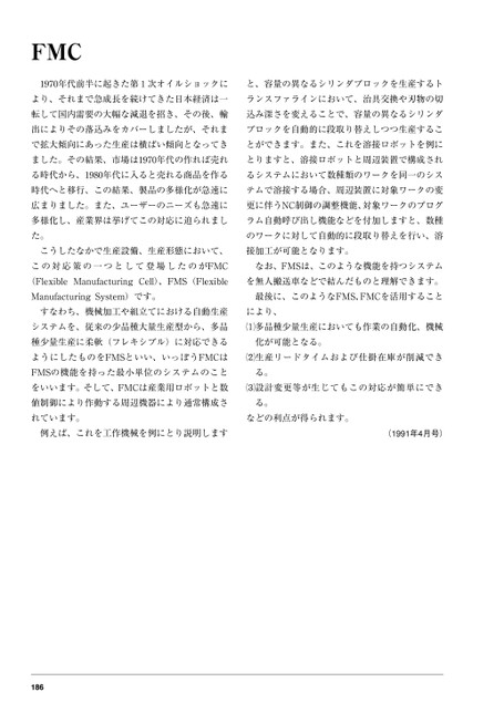 FMC1970年代前半に起きた第1次オイルショックにと、容量の異なるシリンダブロックを生産するトより、それまで急成長を続けてきた日本経済は一ランスファラインにおいて、治具交換や刃物の切転して国内需要の大幅な減退を招き、その後、輸込み深さを変えることで、容量の異なるシリンダ出によりその落込みをカバーしましたが、それまブロックを自動的に段取り替えしつつ生産するこで拡大傾向にあった生産は横ばい傾向となってきとができます。また、これを溶接ロボットを例にました。その結果、市場は1970年代の作れば売れとりますと、溶接ロボットと周辺装置で構成される時代から、1980年代に入ると売れる商品を作るるシステムにおいて数種類のワークを同一のシス時代へと移行、この結果、製品の多様化が急速にテムで溶接する場合、周辺装置に対象ワークの変広まりました。また、ユーザーのニーズも急速に更に伴うNC制御の調整機能、対象ワークのプログ多様化し、産業界は挙げてこの対応に迫られましラム自動呼び出し機能などを付加しますと、数種た。のワークに対して自動的に段取り替えを行い、溶こうしたなかで生産設備、生産形態において、接加工が可能となります。この対応策の一つとして登場したのがFMCなお、FMSは、このような機能を持つシステム(FlexibleManufacturingCell)、FMS(Flexibleを無人搬送車などで結んだものと理解できます。ManufacturingSystem)です。最後に、このようなFMS,FMCを活用することすなわち、機械加工や組立てにおける自動生産システムを、従来の少品種大量生産型から、多品により、多品種少量生産においても作業の自動化、機械種少量生産に柔軟(フレキシブル)に対応できる化が可能となる。ようにしたものをFMSといい、いっぽうFMCは生産リードタイムおよび仕掛在庫が削減できFMSの機能を持った最小単位のシステムのことる。をいいます。そして、FMCは産業用ロボットと数設計変更等が生じてもこの対応が簡単にでき値制御により作動する周辺機器により通常構成さる。れています。などの利点が得られます。例えば、これを工作機械を例にとり説明します(1991年4月号)186