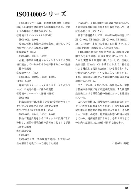 ISO14000シリーズISO14000シリーズは、国際標準化機構(ISO)が上記の内、ISO14001のみが認証の対象であり、制定した環境管理に関する国際規格であり、主にその他の規格は利用可能な指針規格であって、認6つの規格から構成されている。①環境マネジメントシステム(EMS)ISO14001,14004証を必要とはしていない。日本工業規格としては、1996年10月20日付けでJISQ14001,JISQ14004,JISQ14010,JISQ14011,環境に係わる組織の方針を定め、実行していくJISQ14012が、また1997年11月20日付けでJISQためのシステムに係わる規格②環境監査(EA)ISO14010,14011,1401214040が国際一致規格として制定された。ISO14001の具体的な展開方法は、環境保全に関する方針や目標、計画を制定(Plan:P)し、企業、事業所の環境マネジメントシステムが規これを実施および運用(Do:D)して、点検と格に適合しているかどうかを評価するための監査是正措置(Check:C)を講じたうえで、経営者に係わる規格③環境ラベル(EL)による見直しと是正(Action:A)を行うという、いわゆるPDCAサイクルで組み立てられている。ISO14020,14021,14022,14023,また、環境保全に関する方針は対外的に公表が義14024,14025務付けられている。環境主張(メッセージ入りラベル、シンボルマまた、LCAは、企業のEMSとの関連から、環境ーク)の使用の統一に係わる規格目標値や基準値に対する達成度評価、また新規製④環境パフォーマンス評価(EPE)品開発における環境負荷の評価においても適用さISO14031れている。組織の環境行動、実績を定量的・定性的パラメーこれらの規格は、環境保全への関心が高いヨータを使って評価する手法に関する規格ロッパを中心に普及してきたが、日本でも電気機⑤ライフサイクルアセスメント(LCA)械を中心に製造業の取得が広がっており、さらにISO14040,14041,14042,14043サービス業、小売業、地方自治体等へ取得が展開製品の環境負荷をライフサイクルの段階ごとにしている。通商産業省によると、今年7月末まで分析し、製品の環境負荷の改善を目的とする手法の国内の認証数は2,338件で世界で最も多い。に関する規格⑥用語と定義ISO14050ISO14000シリーズの規格で述語として用いる主な用語と定義について規定した規格(1999年11月号)261