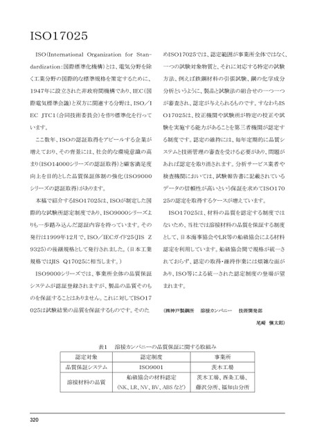 ISO17025ISO(InternationalOrganizationforStan-めISO17025では、認定範囲が事業所全体ではなく、dardization:国際標準化機構)とは、電気分野を除一つの試験対象物質と、それに対応する特定の試験く工業分野の国際的な標準規格を策定するために、方法、例えば鉄鋼材料の引張試験、鋼の化学成分1947年に設立された非政府間機構であり、IEC(国分析というように、製品と試験法の組合せの一つ一つ際電気標準会議)と双方に関連する分野は、ISO/Iが審査され、認定が与えられるものです。すなわちISECJTC1(合同技術委員会)を作り標準化を行ってO17025は、校正機関や試験所が特定の校正や試います。験を実施する能力があることを第三者機関が認定すここ数年、ISOの認証取得をアピールする企業がる制度です。認定の維持には、毎年定期的に品質シ増えており、その背景には、社会的な環境意識の高ステムと技術管理の審査を受ける必要があり、問題がまり(ISO14000シリーズの認証取得)と顧客満足度あれば認定を取り消されます。分析サービス業者や向上を目的とした品質保証体制の強化(ISO9000検査機関においては、試験報告書に記載されているシリーズの認証取得)があります。データの信頼性が高いという保証を求めてISO170本稿で紹介するISO17025は、ISOが制定した国25の認定を取得するケースが増えています。際的な試験所認定制度であり、ISO9000シリーズよISO17025は、材料の品質を認定する制度ではりも一歩踏み込んだ認証内容を持っています。そのないため、当社では溶接材料の品質を保証する制度発行は1999年12月で、ISO/IECガイド25(JISZとして、日本海事協会やLR等の船級協会による材料9325)の後継規格として発行されました。(日本工業認定を利用しています。船級協会間で規格が統一さ規格ではJISQ17025に相当します。)れておらず、認定の取得・維持作業には煩雑な面がISO9000シリーズでは、事業所全体の品質保証あり、ISO等による統一された認定制度の登場が望システムが認証登録されますが、製品の品質そのもまれます。のを保証することはありません。これに対してISO17025は試験結果の品質を保証するものです。そのた(㈱神戸製鋼所溶接カンパニー技術開発部尾崎愼太郎)表1溶接カンパニーの品質保証に関する取組み認定対象品質保証システム溶接材料の品質認定制度ISO9001事業所茨木工場船級協会の材料認定茨木工場、西条工場、(NK、LR、NV、BV、ABSなど)藤沢分所、福知山分所203