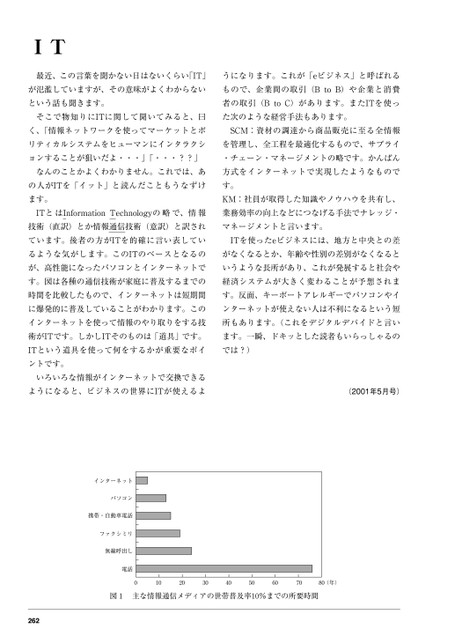 IT最近、この言葉を聞かない日はないくらい「IT」うになります。これが「eビジネス」と呼ばれるが氾濫していますが、その意味がよくわからないもので、企業間の取引(BtoB)や企業と消費という話も聞きます。者の取引(BtoC)があります。またITを使っそこで物知りにITに関して聞いてみると、曰た次のような経営手法もあります。く、「情報ネットワークを使ってマーケットとポSCM:資材の調達から商品販売に至る全情報リティカルシステムをヒューマンにインタラクシを管理し、全工程を最適化するもので、サプライョンすることが狙いだよ・・・」「・・・??」・チェーン・マネージメントの略です。かんばんなんのことかよくわかりません。これでは、あ方式をインターネットで実現したようなものでの人がITを「イット」と読んだこともうなずけす。ます。KM:社員が取得した知識やノウハウを共有し、ITとはInformationTechnologyの略で、情報業務効率の向上などにつなげる手法でナレッジ・技術(直訳)とか情報通信技術(意訳)と訳されマネージメントと言います。ています。後者の方がITを的確に言い表していITを使ったeビジネスには、地方と中央との差るような気がします。このITのベースとなるのがなくなるとか、年齢や性別の差別がなくなるとが、高性能になったパソコンとインターネットでいうような長所があり、これが発展すると社会やす。図は各種の通信技術が家庭に普及するまでの経済システムが大きく変わることが予想されま時間を比較したもので、インターネットは短期間す。反面、キーボートアレルギーでパソコンやイに爆発的に普及していることがわかります。このンターネットが使えない人は不利になるという短インターネットを使って情報のやり取りをする技所もあります。(これをデジタルデバイドと言い術がITです。しかしITそのものは「道具」です。ます。一瞬、ドキッとした読者もいらっしゃるのITという道具を使って何をするかが重要なポイでは?)ントです。いろいろな情報がインターネットで交換できるようになると、ビジネスの世界にITが使えるよ(2001年5月号)インターネットパソコン携帯・自動車電話ファクシミリ無線呼出し電話01020304050607080(年)図1主な情報通信メディアの世帯普及率10%までの所要時間262