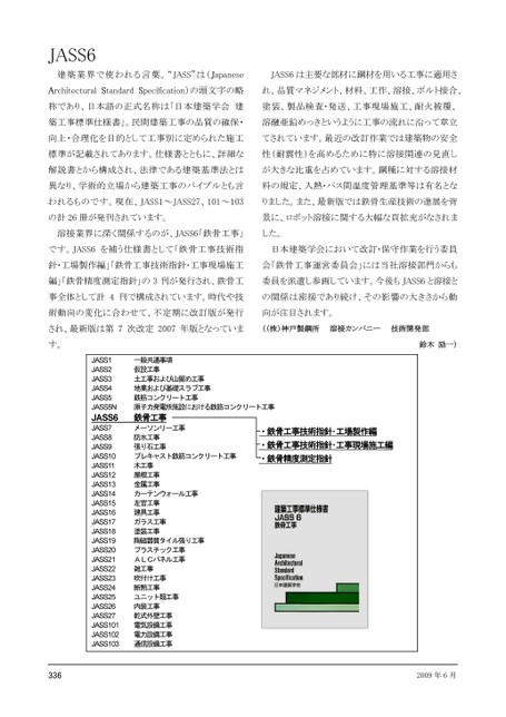 JASS6建築業界で使われる言葉。“JASS”は(JapaneseJASS6は主要な部材に鋼材を用いる工事に適用さArchitecturalStandardSpecification)の頭文字の略れ、品質マネジメント、材料、工作、溶接、ボルト接合、称であり、日本語の正式名称は「日本建築学会建塗装、製品検査・発送、工事現場施工、耐火被覆、築工事標準仕様書」。民間建築工事の品質の確保・溶融亜鉛めっきというように工事の流れに沿って章立向上・合理化を目的として工事別に定められた施工てされています。最近の改訂作業では建築物の安全標準が記載されてあります。仕様書とともに、詳細な性(耐震性)を高めるために特に溶接関連の見直し解説書とから構成され、法律である建築基準法とはが大きな比重を占めています。鋼種に対する溶接材異なり、学術的立場から建築工事のバイブルとも言料の規定、入熱・パス間温度管理基準等は有名となわれるものです。現在、JASS1~JASS27、101~103りました。また、最新版では鉄骨生産技術の進展を背の計26冊が発刊されています。景に、ロボット溶接に関する大幅な頁拡充がなされま溶接業界に深く関係するのが、JASS6「鉄骨工事」した。です。JASS6を補う仕様書として「鉄骨工事技術指日本建築学会において改訂・保守作業を行う委員針・工場製作編」「鉄骨工事技術指針・工事現場施工会「鉄骨工事運営委員会」には当社溶接部門からも編」「鉄骨精度測定指針」の3刊が発行され、鉄骨工委員を派遣し参画しています。今後もJASS6と溶接と事全体として計4刊で構成されています。時代や技の関係は密接であり続け、その影響の大きさから動術動向の変化に合わせて、不定期に改訂版が発行向が注目されます。され、最新版は第7次改定2007年版となっていま((株)神戸製鋼所溶接カンパニー技術開発部す。鈴木励一)・鉄骨工事技術指針・工場製作編・鉄骨工事技術指針・工事現場施工編・鉄骨精度測定指針一般共通事項仮設工事土工事および山留め工事地業および基礎スラブ工事鉄筋コンクリート工事原子力発電所施設における鉄筋コンクリート工事鉄骨工事メーソンリー工事防水工事張り石工事プレキャスト鉄筋コンクリート工事木工事屋根工事金属工事カーテンウォール工事左官工事建具工事ガラス工事塗装工事陶磁器質タイル張り工事プラスチック工事ALCパネル工事雑工事吹付け工事断熱工事ユニット類工事内装工事乾式外壁工事電気設備工事電力設備工事通信設備工事2009年6月JASS1JASS2JASS3JASS4JASS5JASS5NJASS6JASS7JASS8JASS9JASS10JASS11JASS12JASS13JASS14JASS15JASS16JASS17JASS18JASS19JASS20JASS21JASS22JASS23JASS24JASS25JASS26JASS27JASS101JASS102JASS103363