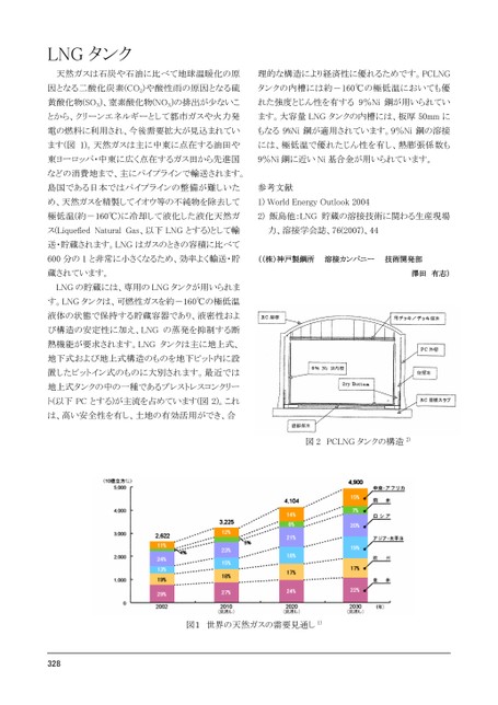 LNGタンク天然ガスは石炭や石油に比べて地球温暖化の原理的な構造により経済性に優れるためです。PCLNG因となる二酸化炭素(CO2)や酸性雨の原因となる硫タンクの内槽には約-160℃の極低温においても優黄酸化物(SOX)、窒素酸化物(NOX)の排出が少ないこれた強度とじん性を有する9%Ni鋼が用いられていとから、クリーンエネルギーとして都市ガスや火力発ます。大容量LNGタンクの内槽には、板厚50mmに電の燃料に利用され、今後需要拡大が見込まれていもなる9%Ni鋼が適用されています。9%Ni鋼の溶接ます(図1)。天然ガスは主に中東に点在する油田やには、極低温で優れたじん性を有し、熱膨張係数も東ヨーロッパ・中東に広く点在するガス田から先進国9%Ni鋼に近いNi基合金が用いられています。などの消費地まで、主にパイプラインで輸送されます。島国である日本ではパイプラインの整備が難しいた参考文献め、天然ガスを精製してイオウ等の不純物を除去して1)WorldEnergyOutlook2004極低温(約-160℃)に冷却して液化した液化天然ガ2)飯島他:LNG貯蔵の溶接技術に関わる生産現場ス(LiquefiedNaturalGas、以下LNGとする)として輸力、溶接学会誌、76(2007)、44送・貯蔵されます。LNGはガスのときの容積に比べて600分の1と非常に小さくなるため、効率よく輸送・貯((株)神戸製鋼所溶接カンパニー技術開発部蔵されています。LNGの貯蔵には、専用のLNGタンクが用いられます。LNGタンクは、可燃性ガスを約-160℃の極低温液体の状態で保持する貯蔵容器であり、液密性および構造の安定性に加え、LNGの蒸発を抑制する断熱機能が要求されます。LNGタンクは主に地上式、地下式および地上式構造のものを地下ピット内に設置したピットイン式のものに大別されます。最近では地上式タンクの中の一種であるプレストレスコンクリート(以下PCとする)が主流を占めています(図2)。これは、高い安全性を有し、土地の有効活用ができ、合澤田有志)図2PCLNGタンクの構造2)図1世界の天然ガスの需要見通し1)283