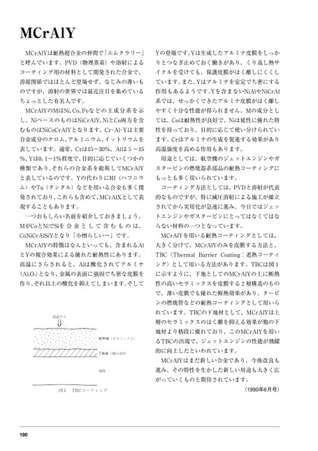 MCrAlYMCrAlYは耐熱超合金の仲間で「エムクラリー」Yの登場です。Yは生成したアルミナ皮膜をしっかと呼んでいます。PVD(物理蒸着)や溶射によるりとつなぎ止めておく働きがあり、くり返し熱サコーティング用の材料として開発された合金で、イクルを受けても、保護皮膜がはく離しにくくし溶接関係ではほとんど登場せず、なじみの薄いもています。また、Yはアルミナを安定でち密にするのですが、溶射の世界では最近注目を集めている作用もあるようです。Yを含まないNiAlやNiCrAlちょっとした有名人です。系では、せっかくできたアルミナ皮膜がはく離しMCrAlYのMはNi,Co,Feなどの主成分系を示やすく十分な性能が得られません。Mの成分としし、NiベースのものはNiCrAlY,NiとCo両方を含ては、Coは耐熱性が良好で、Niは延性に優れた特むものはNiCoCrAlYとなります。Cr・Al・Yは主要性を持っており、目的に応じて使い分けられてい合金成分のクロム、アルミニウム、イットリウムをます。Crはアルミナの生成を促進する効果があり表しています。通常、Crは15〜30%,Alは5〜15高温強度を高める作用もあります。%,Yは0.1〜1%程度で、目的に応じていくつかの用途としては、航空機のジェットエンジンやガ種類であり、それらの合金系を総称してMCrAlYスタービンの燃焼器系部品の耐熱コーティングにと表しているのです。Yの代わりにHf(ハフニウもっとも多く用いられています。ム)やTa(タンタル)などを用いる合金も多く開コーティング方法としては、PVDと溶射が代表発されており、これらも含めて、MCrAlXとして表的なものですが、特に減圧溶射による施工が確立現することもあります。されてから実用化が急速に進み、今日ではジェッ一つおもしろい名前を紹介しておきましょう。トエンジンやガスタービンにとってはなくてはなMがCoとNiでSiを合金として含むものは、らない材料の一つとなっています。CoNiCrAlSiYとなり「小憎らしいー」です。MCrAlYを用いる耐熱コーティングとしては、MCrAlYの特徴はなんといっても、含まれるAl大きく分けて、MCrAlYのみを皮膜する方法と、とYの複合効果による優れた耐熱性にあります。TBC(ThermalBarrierCoating:遮熱コーティ高温にさらされると、Alは酸化されてアルミナング)として用いる方法があります。TBCは図1(Al2O3)となり、金属の表面に強固でち密な皮膜をに示すように、下地としてのMCrAlYの上に断熱作り、それ以上の酸化を抑えてしまいます。そして性の高いセラミックスを皮膜する2層構造のもので、薄い皮膜でも優れた断熱効果があり、タービンの燃焼管などの耐熱コーティングとして用いられています。TBCの下地材として、MCrAlYは上層のセラミックスのはく離を抑える効果が他の下地材より格段に優れており、このMCrAlYを用いるTBCの出現で、ジェットエンジンの性能が飛躍的に向上したといわれています。MCrAlYはまだ新しい合金であり、今後改良も進み、その特性を生かした新しい用途も大きく広がっていくものと期待されています。(1990年6月号)190