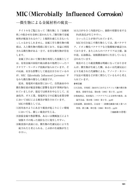 MIC(MicrobiallyInfluencedCorrosion)―微生物による金属材料の腐食―タイトルをご覧になって「微生物」と「金属材入口が小さく内部が広い、独特の形態を有する料」の取合せを奇妙に思われたり、「微生物で金属Pit状食孔が生じやすい。材料が腐食されるの?」と疑問を感じた方もいらといったことが挙げられています。っしゃるかもしれません。金属工学と微生物の関MICを引き起こす微生物としては、鉄バクテリ係は、人と微生物の関係に似ており、有益に利用ア、イオン酸化バクテリアなど数種類が確認されされる微生物がある一方で、有害な微生物が存在ております。またこれらのバクテリアは土壌、海します。中泥、石油製品、切削潤滑油中に生存していると金属工学において微生物を利用した技術として言われています。は、有用金属の回収や鉱山排水の処理といったバ現在のところ腐食機構は明確になっておりませクテリア・リーチング技術が知られています。そんが、微生物が生成した酸、あるいは代謝反応にの反面、有害な影響として最近注目されているのより生成された代謝物による、アノード・カソーが、MIC(MicrobiallyInfluencedCorrosion)すド反応の促進などが深く関与しているものと考えなわち微生物の関与した腐食です。られています。従来、発電所の復水管において、自然海水中の参考文献微生物付着が腐食挙動に影響を及ぼす事例が知ら天谷尚、幸英昭:海水中におけるステンレス鋼の微生物れていましたが、最近では欧米を中心として、石腐食、溶接学会誌、第64巻(1995)第3号、pp146油化学、ガス工業、発電所などの広範な産業分野菊地靖志、松田福久:バクテリアによる材料の腐食、高においてMICによる被害が報告されています。温学会誌、第19巻(1993)第2号、pp49MICの特徴としては、箕浦潤、孫田裕美、白鳥寿一:鉄酸化細菌の鉱工業への河川水のようにあまり腐食が起こりにくい環境利用、鉄と鋼、第72巻(1986)第15号、pp34においても、激しい腐食が生じる。溶接金属や熱影響部、あるいは機械加工により切削キズの残った部位などに発生しやすい。腐食部の表面には、微生物の代謝反応により生成されたと考えられる、こぶ状の生成物が生じやすい。(1995年11月号)191