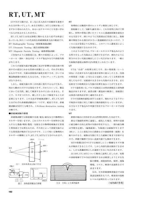 RT,UT,MTGTやXTと聞けば、まっ先に若人向きの自動車を連想さRTれる方が多いでしょう。ある日突然に、MTとは何か知って原理的には胸部や胃のレントゲン検査と同じです。ますかと尋ねられたら、あるいはクルマのことを思い浮か放射線として、X線やγ線を用い、これを材料に向けて照べる人があるかもしれません。射し、材料の背後に置いたフィルムに透過放射線を感光さRT,UT,MTとは実は溶接に携わる人なら必ずお世話にせる方法です。図1のように欠陥部は正常部に比し、放射なっている、次の三つの代表的な非破壊検査方法の略語です。線の吸収される割合が小さい(透過線量が大きい)ので、フRT:RadiographicTesting(放射線透過試験)ィルムは正常部よりも黒化し、このフィルム濃度差によっUT:UltrasonicTesting(超音波探傷試験)て欠陥が識別できるわけです。MT:MagneticParticleTesting(磁粉探傷試験)このようにRTでは、ブローホールやスラグ巻込みのようご存知のように溶接部には、種々の原因によって、ブロな厚さをもった欠陥はよく検出できますが、割れのようにーホール・割れ・溶込不足・スラグ巻込みなどの溶接欠陥厚さの小さい欠陥は検出しにくい欠点があります。一般にが生じます。欠陥検出感度は板厚の2%程度といわれています。これらの溶接欠陥が構造物に及ぼす影響は欠陥自体の性UT状やその部分にかかる負荷の状態によって、それぞれ異なUTは“山彦”の原理と同じです。高い周波数(1〜5るものですが、欠陥は溶接部の強度を低下させ、ひいてはMHz)の音波すなわち超音波を材料に投入したとき、内部構造物破壊の原因ともなるため、十分にチェックしなけれの異質部(欠陥)に当たると反射して戻ってくる性質を利ばなりません。用したもので、反射波の大きさから欠陥の大きさを、またしかし、溶接欠陥の多くが内部に発生するものであり、反射までの時間差から欠陥の位置を知ることができます。外から眺めただけでは発見できず、だからといって、製品UTで通常用いる、パルス反射法には垂直探傷法と斜角探においては当然、壊して検査するわけにはいきません。そ傷法がありますが、前者は鋳・鍛造材の検査に、溶接部にこで、キズをつけたり、壊したりしないで検査することがは後者の斜角法が多く適用されます。必要になります。この方法が非破壊試験で、RT,UT,MTUTの欠陥検出感度はRTとは逆で、割れのようなうすいとはそれぞれ非破壊試験法の一つです。蛇足ですが、非破平板状の欠陥に対して優れた検出感度をもっていますが、壊試験はNDTとも略され、これはnon―destructivetesting小さなスラグ巻込みや単独で存在するブローホールでは劣の略です。●非破壊試験の原理ります。MT非破壊試験では放射線や音波・電気・磁気などの物理的エ鉄粉が磁石に引き寄せられる性質を利用した方法です。ネルギーを用いますが、これらのエネルギーを材料中に投鉄など強磁性材料に通電し、磁化した場合、材料の表面入すると透過・吸収・散乱・反射などの物理的現象が正常部に磁力線の方向と直角の欠陥が存在すると、一部の磁力線と異常部とでは異なるため、その差によって溶接欠陥のよは空間を迂迴し(漏洩磁束)、欠陥部には磁極を生じますうな異常部が検出できるわけです。ここで用いる物理的エ(図3)。ここに着色された鉄粉などの強磁性粉(磁粉)をネルギーの種類により、RT,UT,MTなどと分けられます。振りかけると、磁粉は欠陥に生じた磁極に集まり付着するので、肉眼で観察できない表面欠陥でも検出できます。MTの特徴はRTやUTでは検出しにくい微細なキズや割れが検出できることです。しかし内部欠陥は検出できません。しかも鉄鋼材料にしか適用できない欠点があります。以上RT,UT,MTについて簡単に説明しましたが、実際の溶接現場でどの方法を採用するかは検査しようとする欠陥の種類、溶接部形状、板厚、現場環境、コスト、検査の迅速性などで決まります。なお、日本非破壊検査協会では技量認定制度をもうけ、検査員の技術レベルの証明を行っております。(1979年7月号)y=W・sinθd=W・cosθ深傷図形図2斜角差探傷法の原理192
