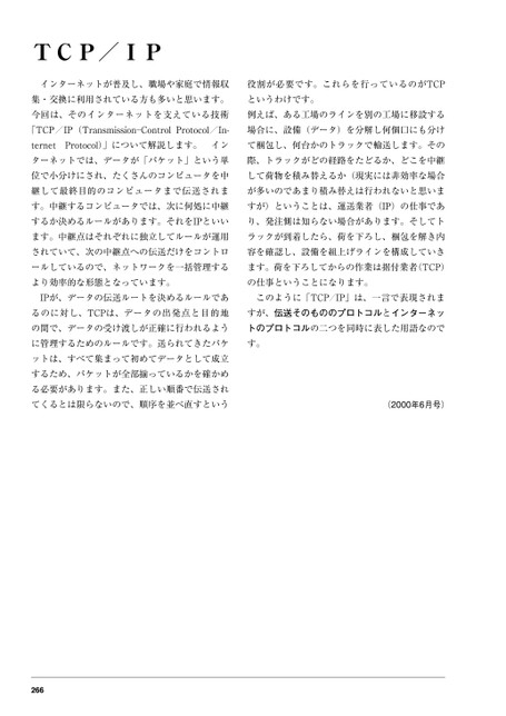 TCP/IPインターネットが普及し、職場や家庭で情報収役割が必要です。これらを行っているのがTCP集・交換に利用されている方も多いと思います。というわけです。今回は、そのインターネットを支えている技術例えば、ある工場のラインを別の工場に移設する「TCP/IP(Transmission―ControlProtocol/In-場合に、設備(データ)を分解し何個口にも分けternetProtocol)」について解説します。インて梱包し、何台かのトラックで輸送します。そのターネットでは、データが「パケット」という単際、トラックがどの経路をたどるか、どこを中継位で小分けにされ、たくさんのコンピュータを中して荷物を積み替えるか(現実には非効率な場合継して最終目的のコンピュータまで伝送されまが多いのであまり積み替えは行われないと思います。中継するコンピュータでは、次に何処に中継すが)ということは、運送業者(IP)の仕事であするか決めるルールがあります。それをIPといいり、発注側は知らない場合があります。そしてトます。中継点はそれぞれに独立してルールが運用ラックが到着したら、荷を下ろし、梱包を解き内されていて、次の中継点への伝送だけをコントロ容を確認し、設備を組上げラインを構成していきールしているので、ネットワークを一括管理するます。荷を下ろしてからの作業は据付業者(TCP)より効率的な形態となっています。の仕事ということになります。IPが、データの伝送ルートを決めるルールであこのように「TCP/IP」は、一言で表現されまるのに対し、TCPは、データの出発点と目的地すが、伝送そのもののプロトコルとインターネッの間で、データの受け渡しが正確に行われるようトのプロトコルの二つを同時に表した用語なのでに管理するためのルールです。送られてきたパケす。ットは、すべて集まって初めてデータとして成立するため、パケットが全部揃っているかを確かめる必要があります。また、正しい順番で伝送されてくるとは限らないので、順序を並べ直すという(2000年6月号)266