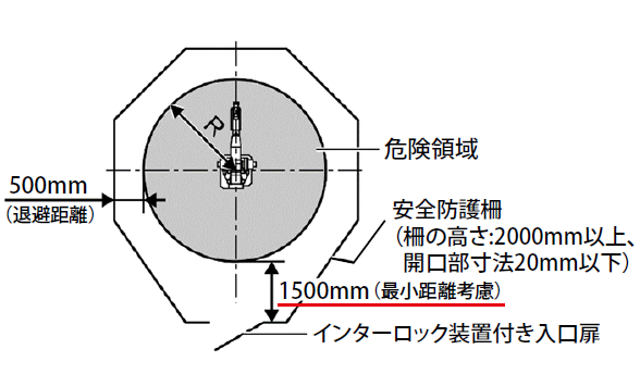 当社の溶接ロボット「」では、最小距離を確保したインターロック付きガードの設置をお願いしています。下図は、ロボットの動作範囲(危険領域)と安全防護柵の設置領域を示したものです。入口扉と危険領域の距離である1500mmは最小距離を加味した距離となっています。