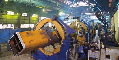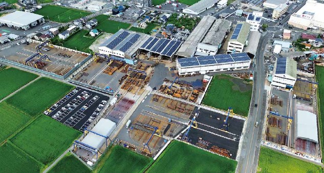 当社は1955年に創立し、1997年にHグレードを取得、ヤードなども拡充していき、総敷地面積46,285㎡まで成長することができました。当社では神戸製鋼さんのロボットを中心とした溶接工程、一次加工も含め、自動化に力を入れてきました。当社が独自開発している生産管理システムにより、事務所に設置したモニタで、各工程の稼働状況や出来高をリアルタイムに一元管理する取組みも行っています。