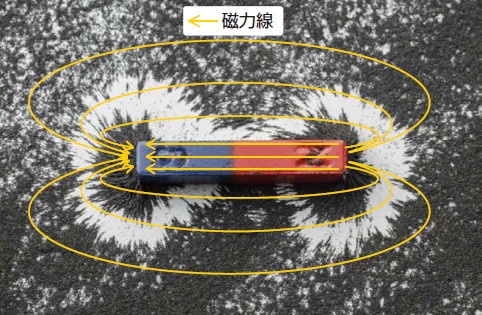 フェライト鋼などの強磁性体を外部から磁化すると、任意の方向を向いている磁区(小さな磁石)が磁化した方向にそろうようになり、磁束線が発生します。磁石における磁力線が空間と内部でもN極からS極に入るので不連続になるのとは異なり、磁化による強磁性体の磁束線は空間と内部を含めN極から出てS極に戻る閉じたループを描きます。
