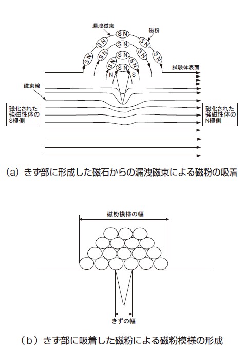 読者の皆さまも子供の頃、磁石と砂鉄で遊んだことがあるのではないでしょうか。図1のように、砂鉄の近くに磁石を置くと、磁石の磁極の周りに砂鉄が集まって来ます。これは、磁石のN極からS極に向かう磁力線によって砂鉄が磁化されて小さな磁石となり、磁力線に沿って集まるためです。磁気探傷試験では、この作用を利用しています。