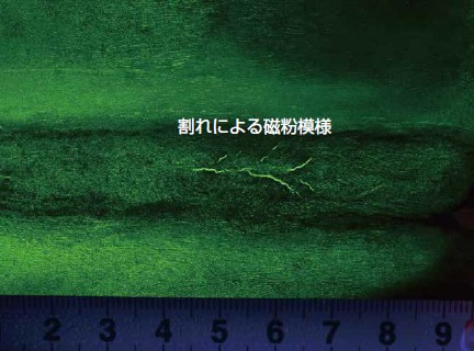 このうち、当社では可搬型の極間法だけを実施しています。図3は、蛍光磁粉を使用した極間法の実施状況です。試験体を若干傾けて分散媒中に懸濁させた磁粉を緩やかに流れるように適用すると、表面または表面直下のきずによる漏洩磁束に沿って磁粉が集まり、ブラックライトできず部の磁粉模様を観察できるようになります。図4は、蛍光磁粉によるきず部の磁粉模様の一例です。