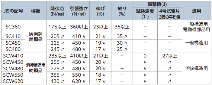表2に炭素鋼鋳鋼品の種類を示します。この他に「ステンレス鋼鋳鋼品」「耐熱鋼鋳鋼品」「高マンガン鋼鋳鋼品」「高温高圧用鋳鋼品」「低温高圧用鋳鋼品」などがあります。