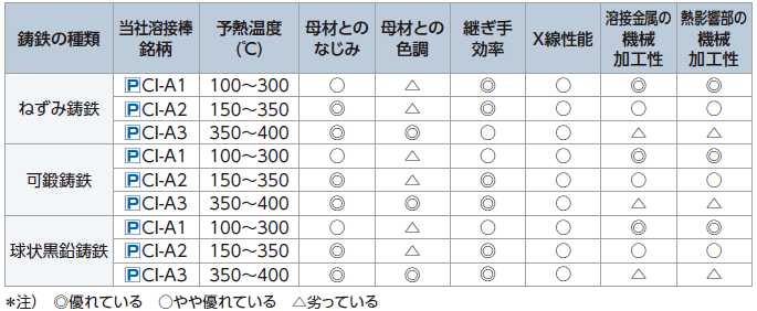 溶接棒の選定と、予熱温度を表3に示します。溶接材料にはそれぞれ特徴がありますので、使い分けが必要です。当社のラインナップ3銘柄について、簡単に特長を述べます。