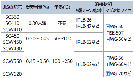 鋳鋼の溶接材料は圧延鋼材や鍛鋼品と同じ溶接材料を使用します。表4に、炭素鋼鋳鋼品の炭素当量をもとにした予熱温度と溶接材料選定の一例を示します。