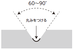 溶接は鋳造欠陥や使用中の破損などの補修に限定されます。補修に際しては、開先角度は図2のように一般鋼材の場合より広く(60~90°)とり、底部はなじみを良くするために丸み(R)をつけて加工してください。加工の際は熱を伴うエアアークガウジングは避け、機械加工やグラインダなどで加工します。機械部品などの補修の場合は欠陥部に油などが浸透している場合があるので、バーナーなどにより400℃程度で加熱除去します。